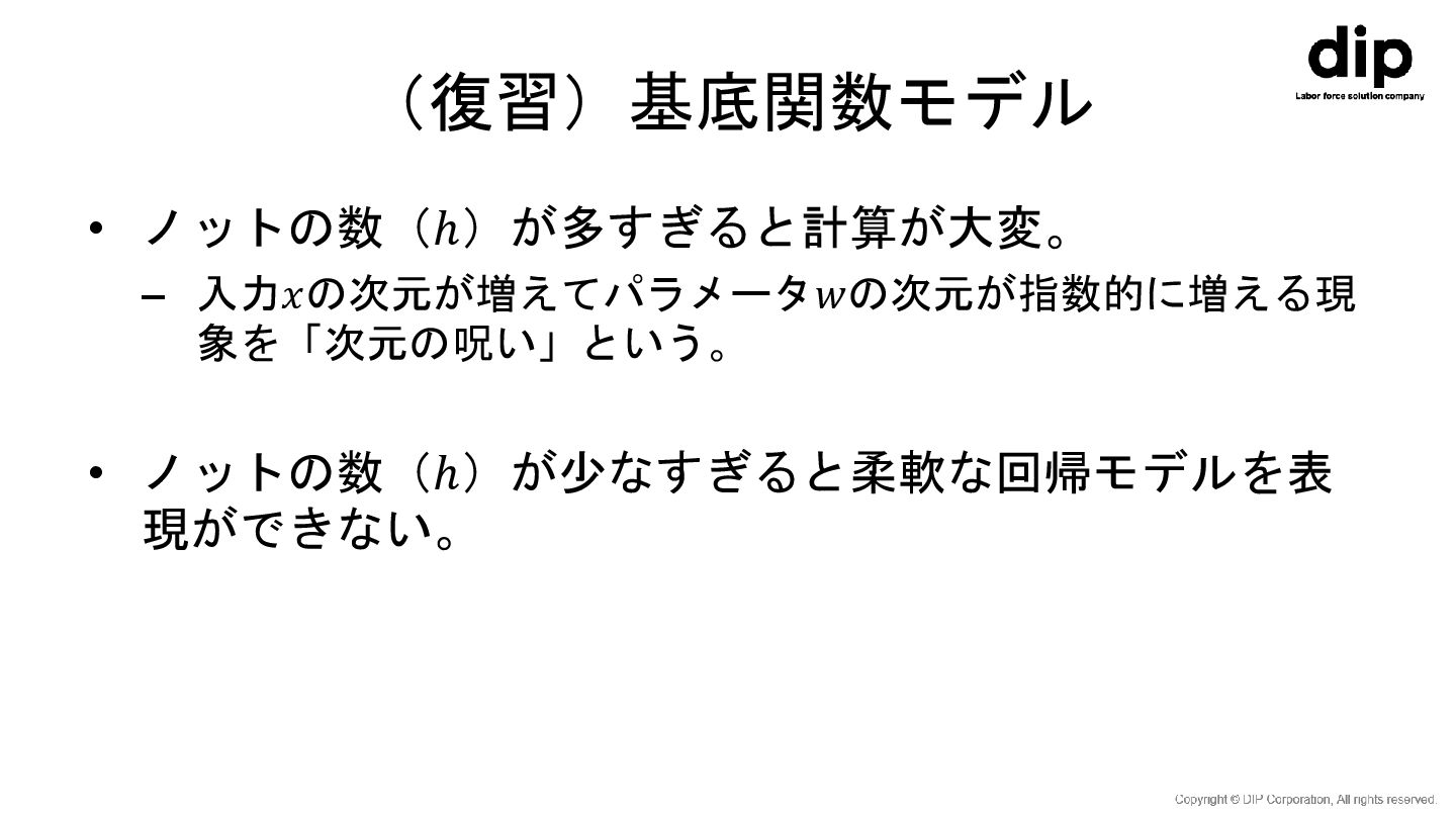 (復習)基底関数モデル • ノットの数(ℎ)が多すぎると計算が大変。 – 入力𝑥の次元が増えてパラメータ𝑤の次元が指数的に増える現 象を「次元の呪い」という。 • ノットの数(ℎ)が少なすぎると柔軟な回帰モデルを表 現ができない。