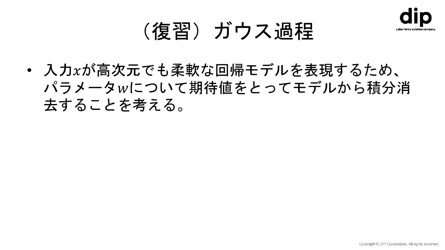 (復習)ガウス過程 • 入力𝑥が高次元でも柔軟な回帰モデルを表現するため、 パラメータ𝑤について期待値をとってモデルから積分消 去することを考える。