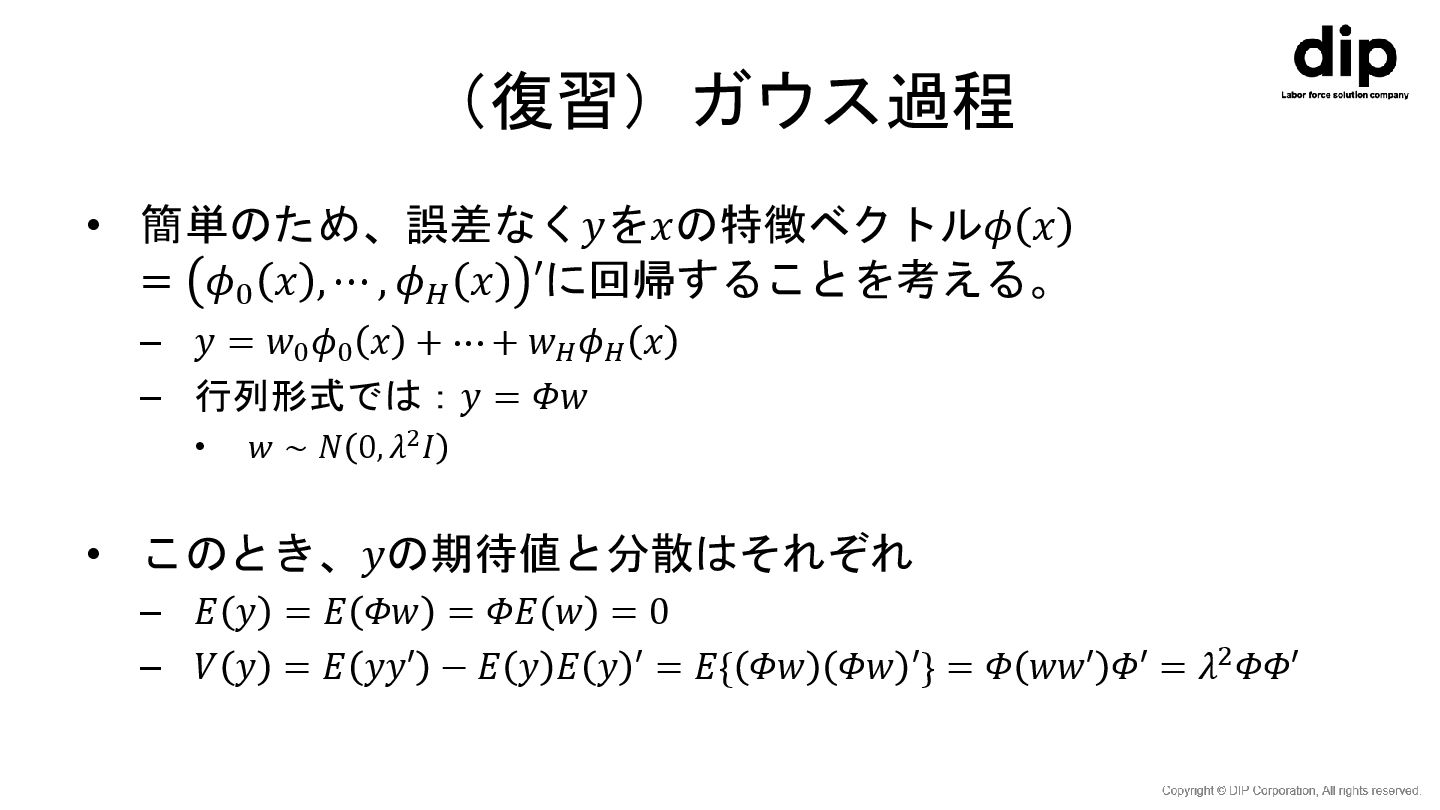 𝜙𝐻 𝑥 ′に回帰することを考える。 – 𝑦 = 𝑤0 𝜙0 𝑥 + ⋯ + 𝑤𝐻 𝜙𝐻 𝑥 – 行列形式では:𝑦 = 𝛷𝑤 • 𝑤 ∼ 𝑁 0, 𝜆2𝐼 • このとき、𝑦の期待値と分散はそれぞれ – 𝐸 𝑦 = 𝐸 𝛷𝑤 = 𝛷𝐸 𝑤 = 0 – 𝑉 𝑦 = 𝐸 𝑦𝑦′ − 𝐸 𝑦 𝐸 𝑦 ′ = 𝐸{ 𝛷𝑤 𝛷𝑤 ′} = 𝛷 𝑤𝑤′ 𝛷′ = 𝜆2𝛷𝛷′