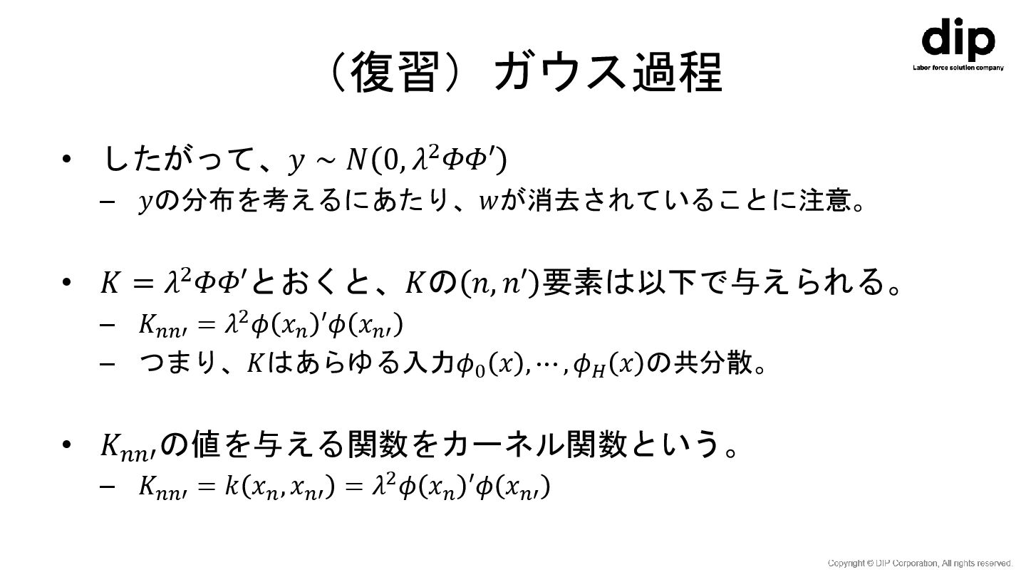𝐾 = 𝜆2𝛷𝛷′とおくと、𝐾の 𝑛, 𝑛′ 要素は以下で与えられる。 – 𝐾𝑛𝑛′ = 𝜆2𝜙 𝑥𝑛 ′𝜙 𝑥𝑛′ – つまり、𝐾はあらゆる入力𝜙0 𝑥 , ⋯ , 𝜙𝐻 𝑥 の共分散。 • 𝐾𝑛𝑛′ の値を与える関数をカーネル関数という。 – 𝐾𝑛𝑛′ = 𝑘 𝑥𝑛 , 𝑥𝑛′ = 𝜆2𝜙 𝑥𝑛 ′𝜙 𝑥𝑛′