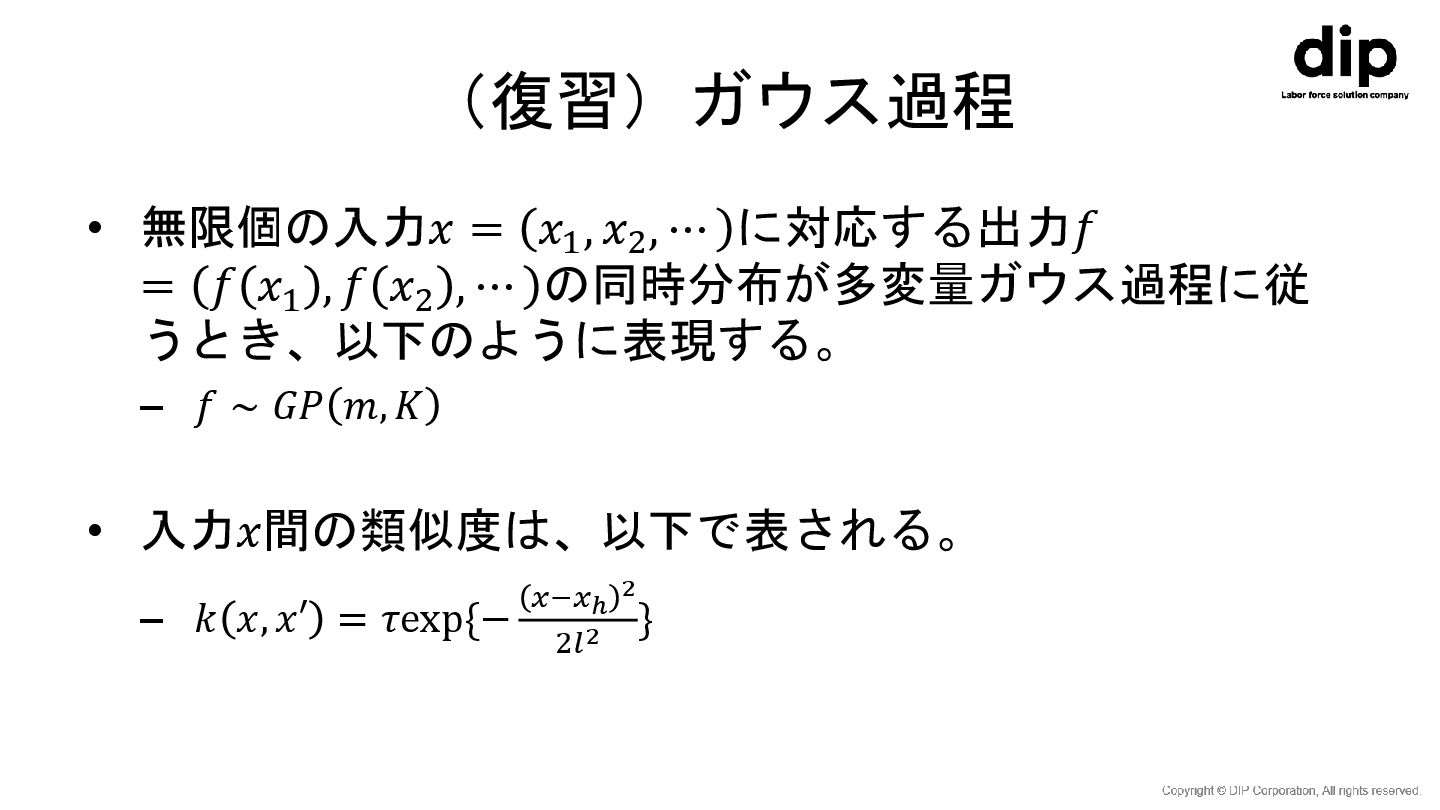 = 𝑓 𝑥1 , 𝑓 𝑥2 , ⋯ の同時分布が多変量ガウス過程に従 うとき、以下のように表現する。 – 𝑓 ∼ 𝐺𝑃 𝑚, 𝐾 • 入力𝑥間の類似度は、以下で表される。 – 𝑘 𝑥, 𝑥′ = 𝜏exp{− 𝑥−𝑥ℎ 2 2𝑙2 }