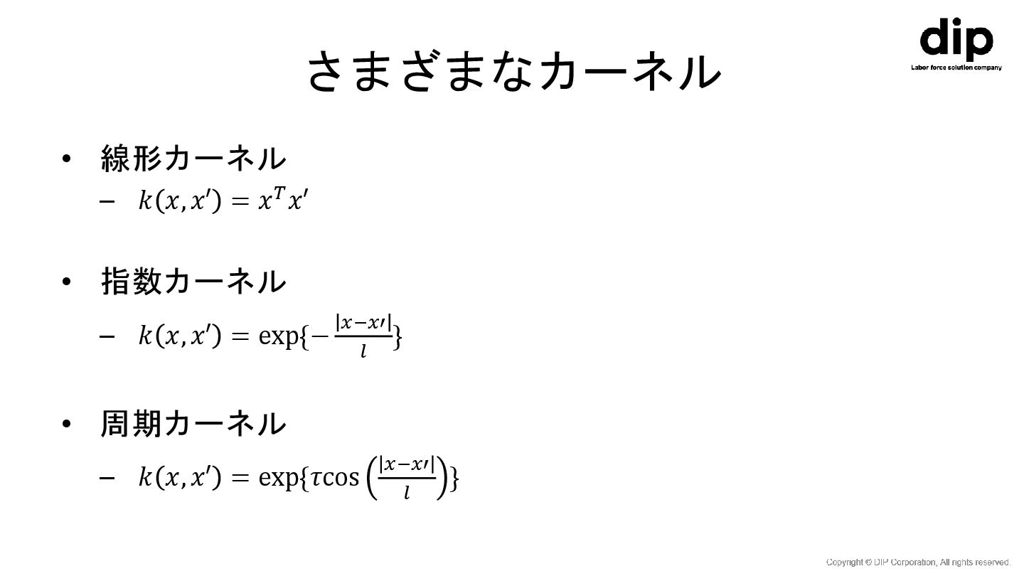 指数カーネル – 𝑘 𝑥, 𝑥′ = exp{− 𝑥−𝑥′ 𝑙 } • 周期カーネル – 𝑘 𝑥, 𝑥′ = exp{𝜏cos 𝑥−𝑥′ 𝑙 }