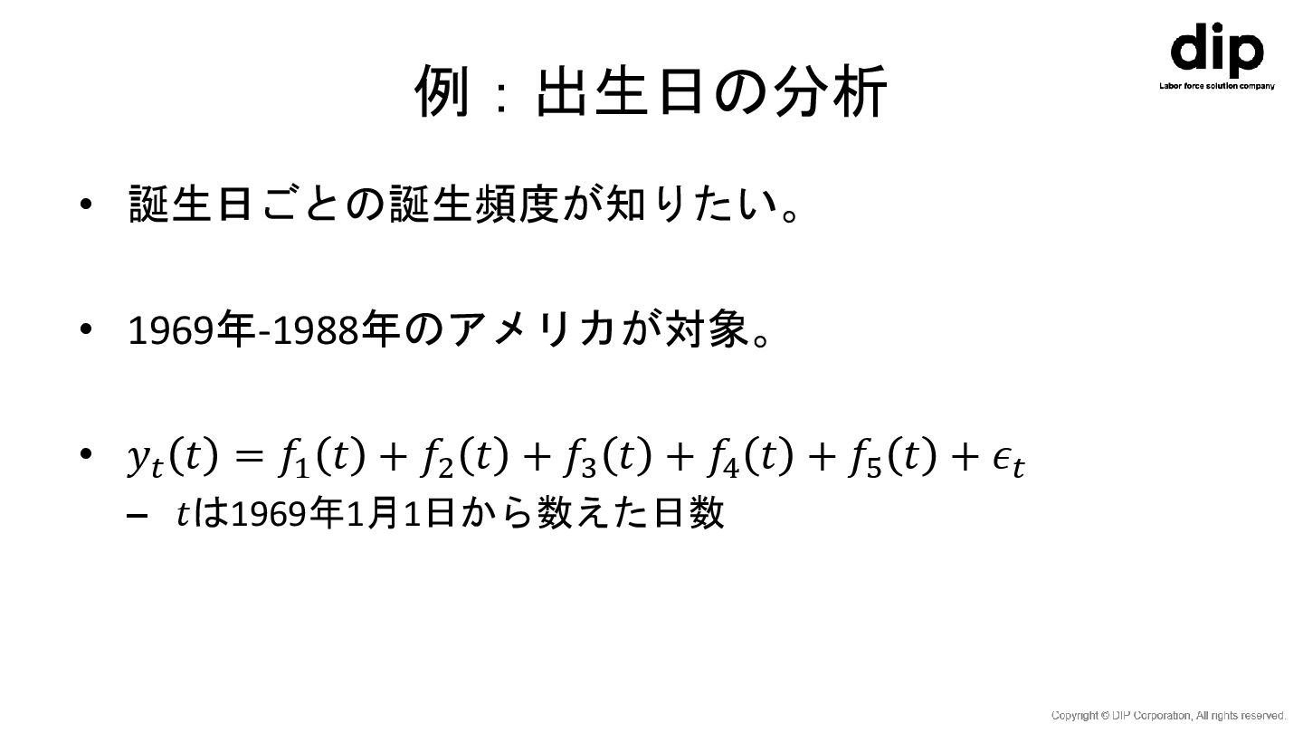 例:出生日の分析 • 誕生日ごとの誕生頻度が知りたい。 • 1969年-1988年のアメリカが対象。 • 𝑦𝑡 𝑡 = 𝑓1