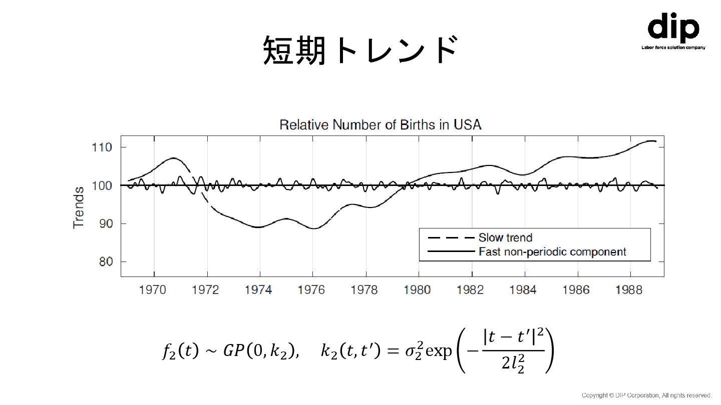 長期トレンド 𝑓1 𝑡 ∼ 𝐺𝑃 0, 𝑘1 , 𝑘1 𝑡,