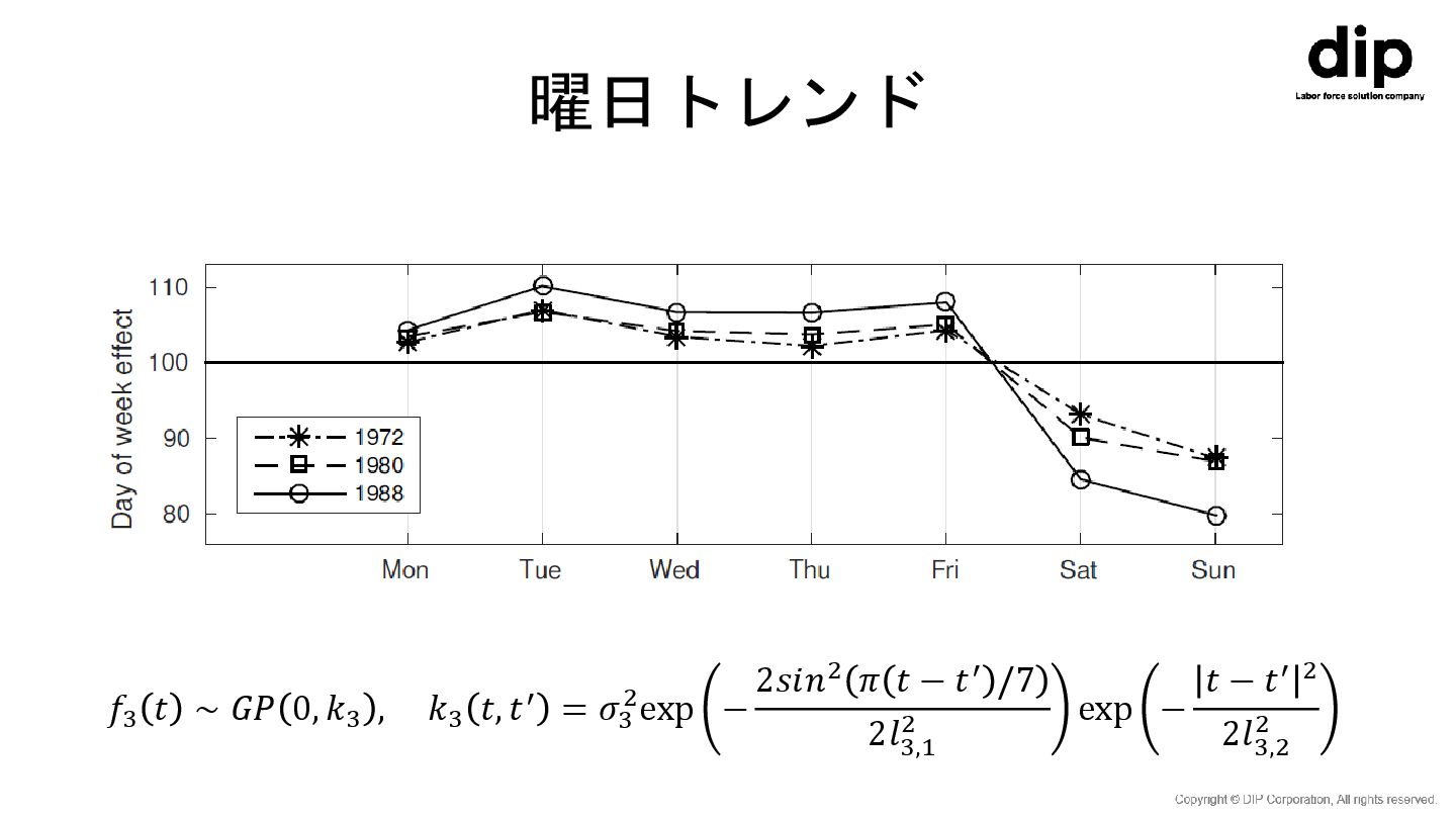 曜日トレンド 𝑓3 𝑡 ∼ 𝐺𝑃 0, 𝑘3 , 𝑘3 𝑡,