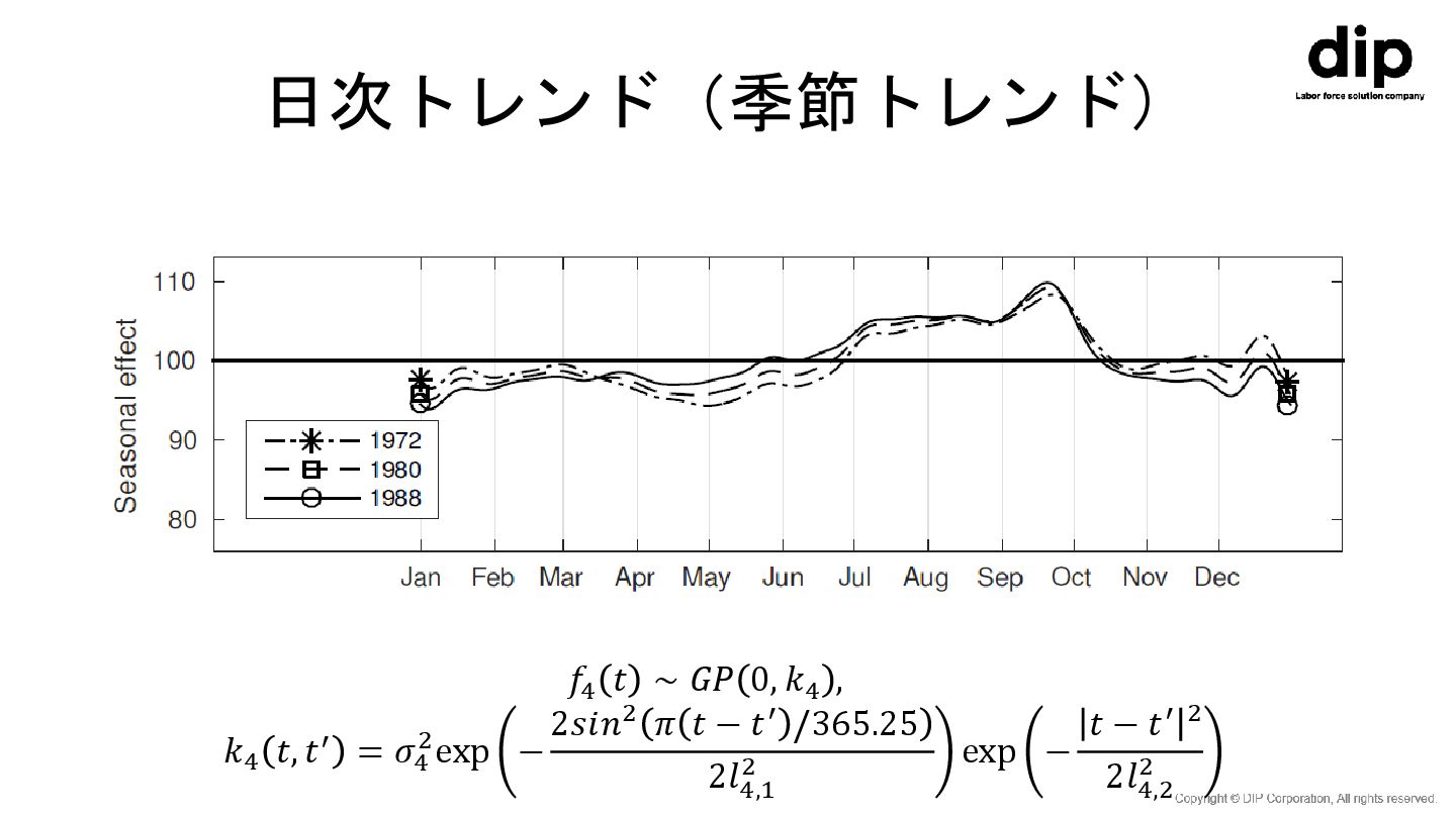 日次トレンド(季節トレンド) 𝑓4 𝑡 ∼ 𝐺𝑃 0, 𝑘4 , 𝑘4 𝑡,