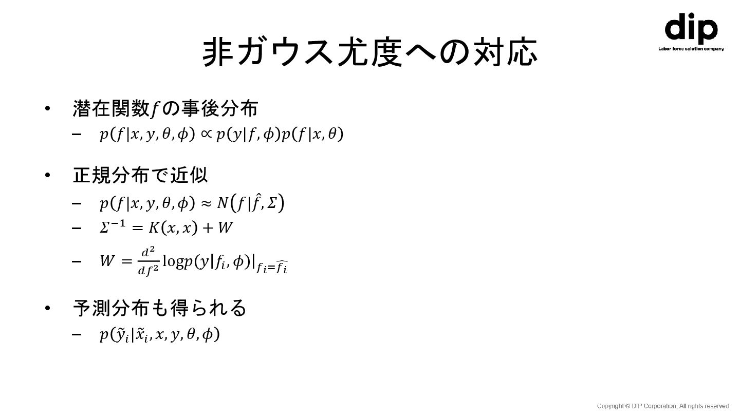 𝑝 𝑦|𝑓, 𝜙 𝑝 𝑓|𝑥, 𝜃 • 正規分布で近似 – 𝑝 𝑓|𝑥, 𝑦, 𝜃, 𝜙 ≈ 𝑁 𝑓| መ 𝑓, 𝛴 – 𝛴−1 = 𝐾 𝑥, 𝑥 + 𝑊 – 𝑊 = 𝑑2 𝑑𝑓2 log𝑝(𝑦 𝑓𝑖 , 𝜙) 𝑓𝑖= 𝑓𝑖 • 予測分布も得られる – 𝑝 𝑦𝑖 | 𝑥𝑖 , 𝑥, 𝑦, 𝜃, 𝜙