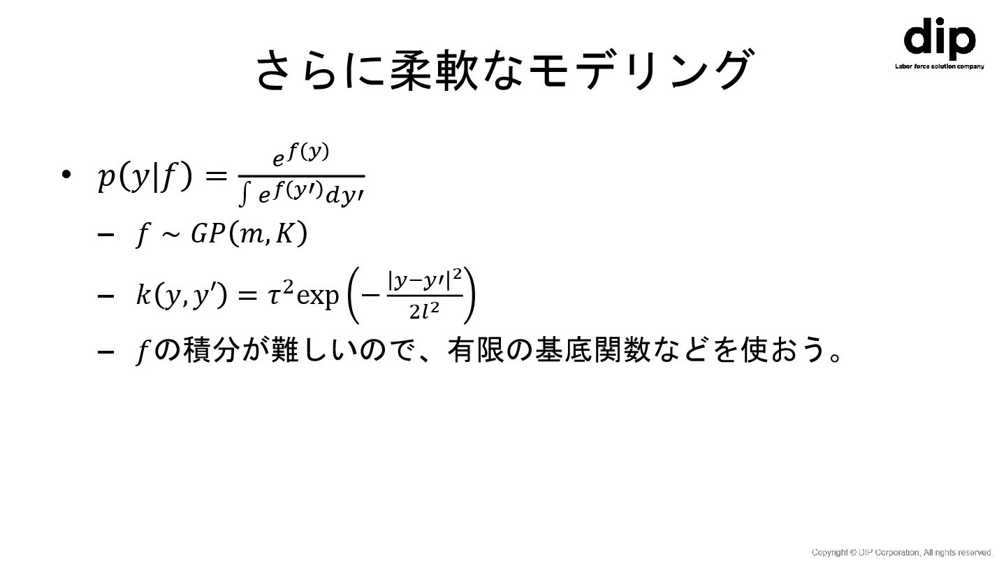 𝑑𝑦′ – 𝑓 ∼ 𝐺𝑃 𝑚, 𝐾 – 𝑘 𝑦, 𝑦′ = 𝜏2exp − 𝑦−𝑦′ 2 2𝑙2 – 𝑓の積分が難しいので、有限の基底関数などを使おう。