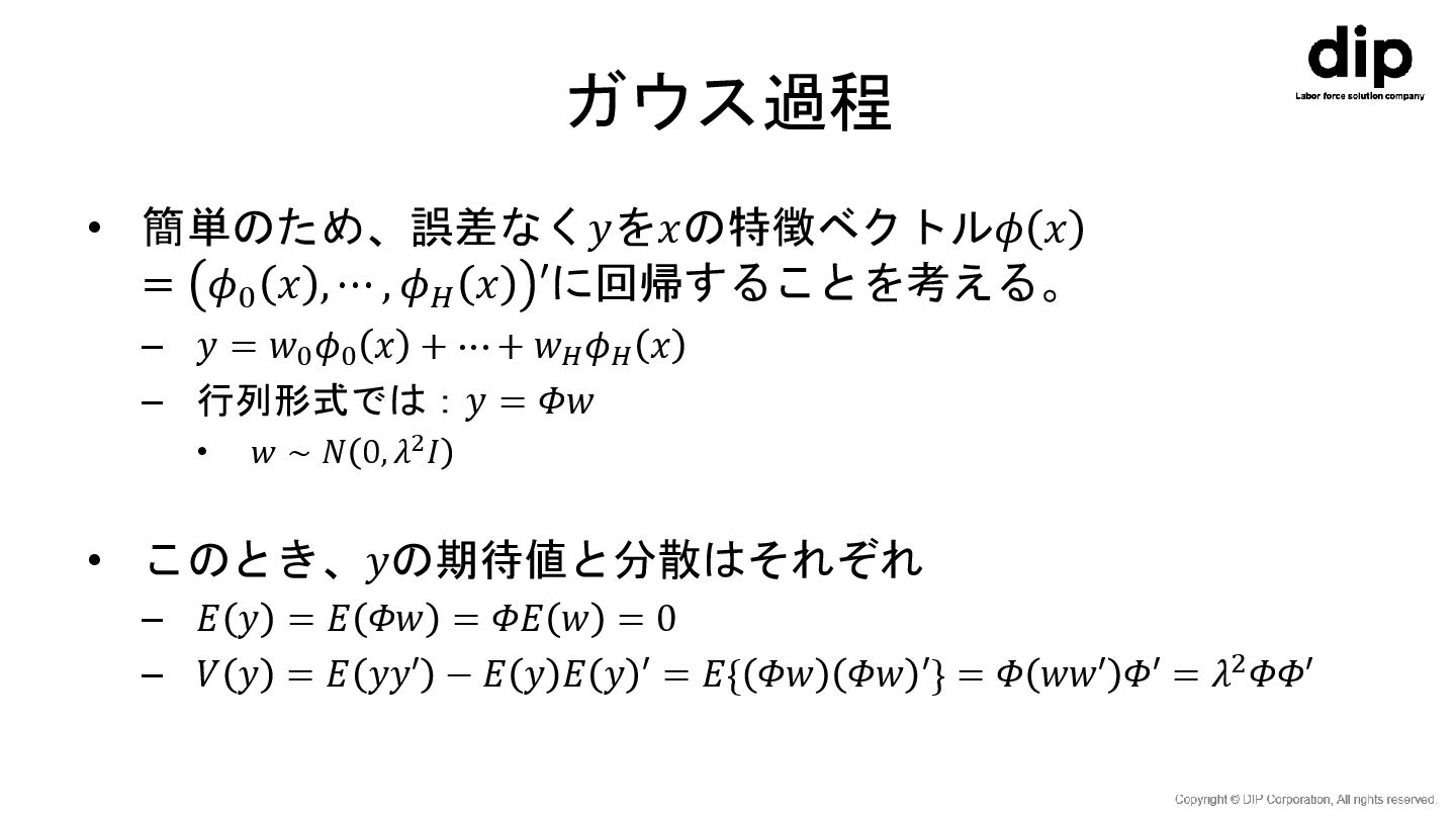𝜙𝐻 𝑥 ′に回帰することを考える。 – 𝑦 = 𝑤0 𝜙0 𝑥 + ⋯ + 𝑤𝐻 𝜙𝐻 𝑥 – 行列形式では:𝑦 = 𝛷𝑤 • 𝑤 ∼ 𝑁 0, 𝜆2𝐼 • このとき、𝑦の期待値と分散はそれぞれ – 𝐸 𝑦 = 𝐸 𝛷𝑤 = 𝛷𝐸 𝑤 = 0 – 𝑉 𝑦 = 𝐸 𝑦𝑦′ − 𝐸 𝑦 𝐸 𝑦 ′ = 𝐸{ 𝛷𝑤 𝛷𝑤 ′} = 𝛷 𝑤𝑤′ 𝛷′ = 𝜆2𝛷𝛷′
