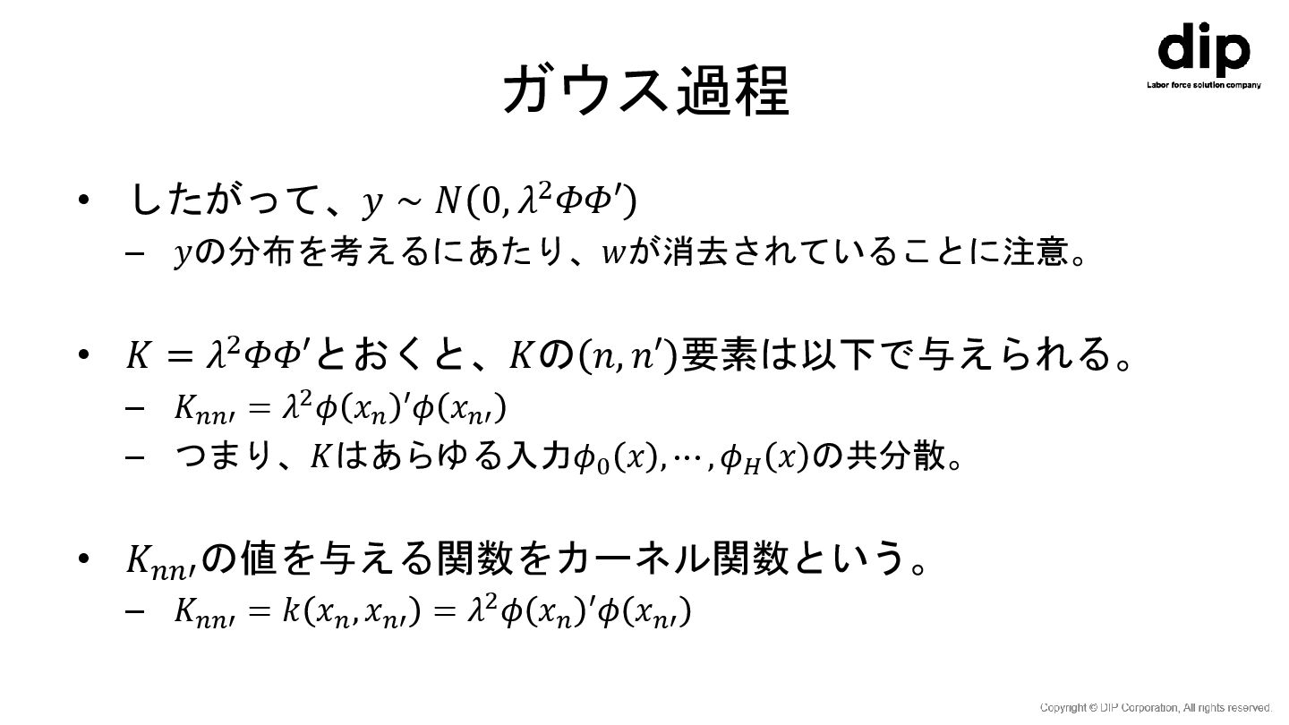 𝐾 = 𝜆2𝛷𝛷′とおくと、𝐾の 𝑛, 𝑛′ 要素は以下で与えられる。 – 𝐾𝑛𝑛′ = 𝜆2𝜙 𝑥𝑛 ′𝜙 𝑥𝑛′ – つまり、𝐾はあらゆる入力𝜙0 𝑥 , ⋯ , 𝜙𝐻 𝑥 の共分散。 • 𝐾𝑛𝑛′ の値を与える関数をカーネル関数という。 – 𝐾𝑛𝑛′ = 𝑘 𝑥𝑛 , 𝑥𝑛′ = 𝜆2𝜙 𝑥𝑛 ′𝜙 𝑥𝑛′