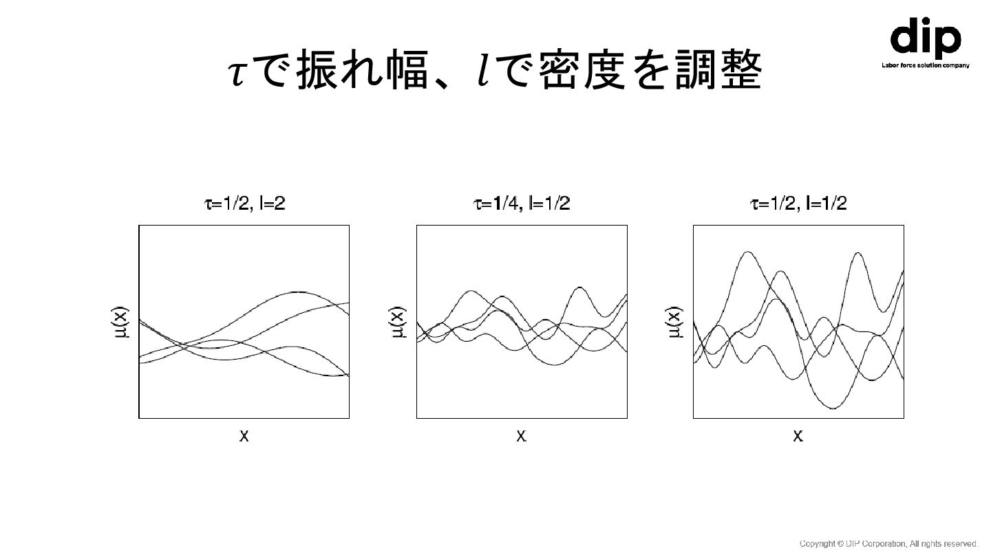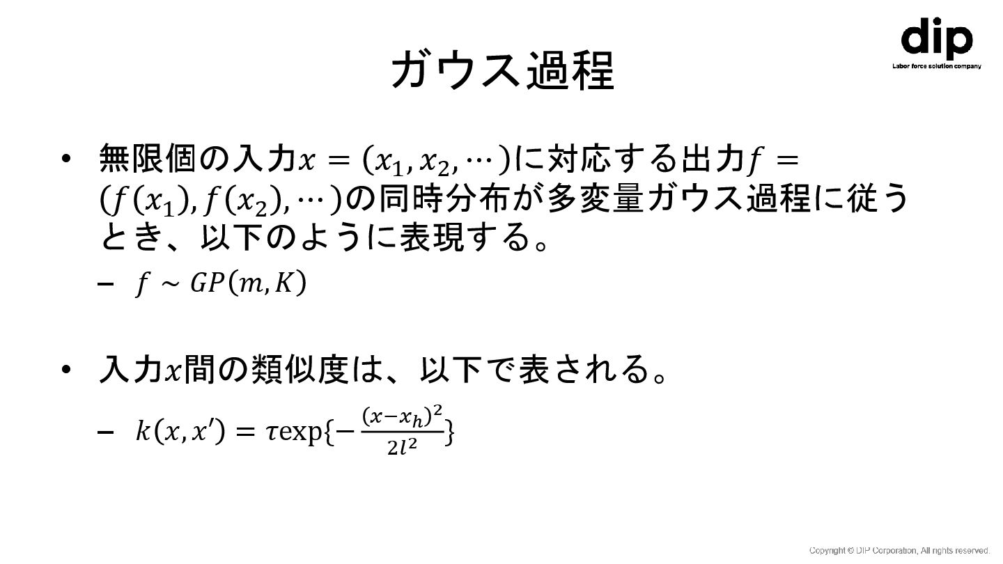 = 𝑓 𝑥1 , 𝑓 𝑥2 , ⋯ の同時分布が多変量ガウス過程に従う とき、以下のように表現する。 – 𝑓 ∼ 𝐺𝑃 𝑚, 𝐾 • 入力𝑥間の類似度は、以下で表される。 – 𝑘 𝑥, 𝑥′ = 𝜏exp{− 𝑥−𝑥ℎ 2 2𝑙2 }