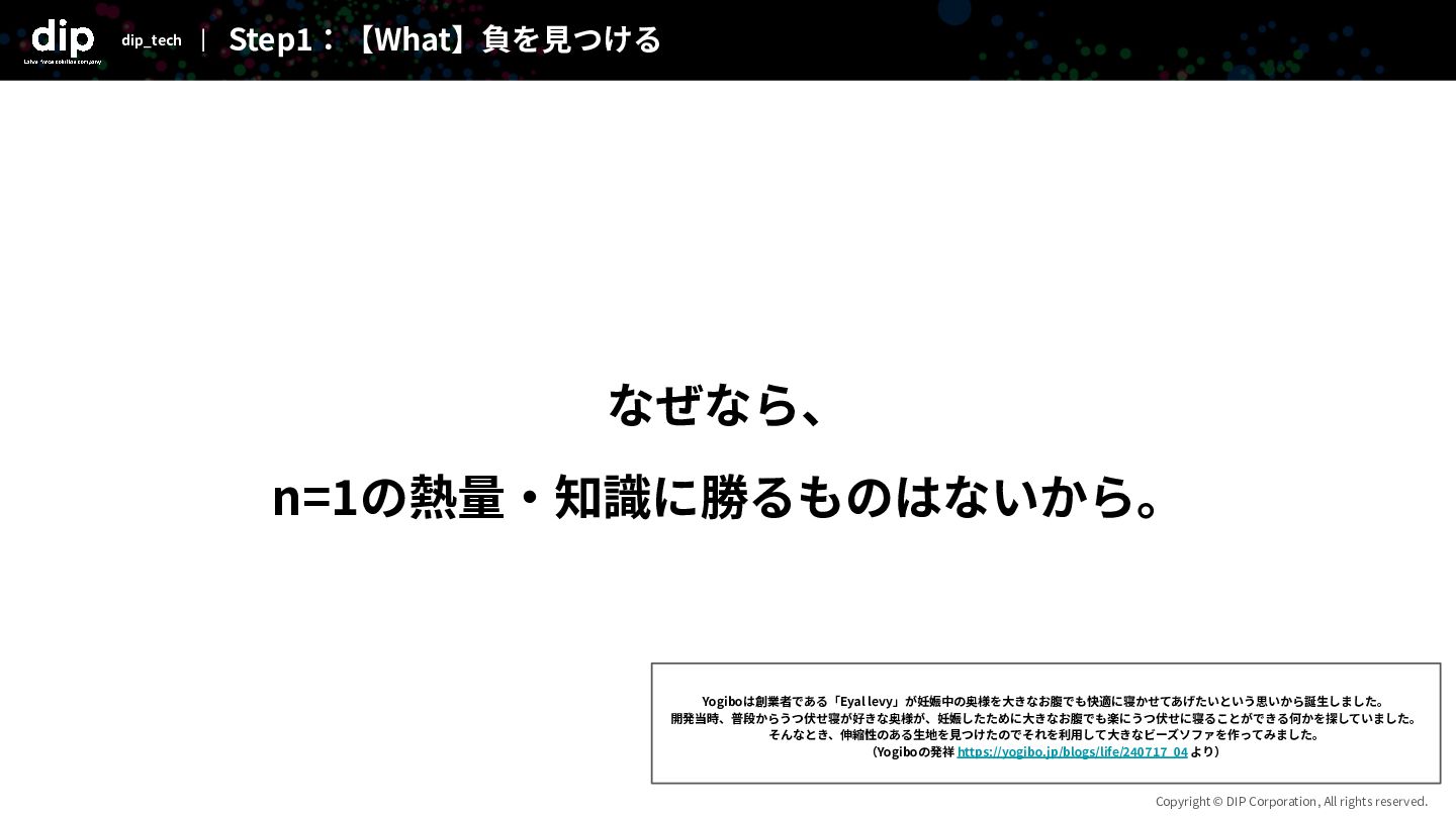 なぜなら、 n=1の熱量‧知識に勝るものはないから。 Yogiboは創業者である「Eyal levy」が妊娠中の奥様を⼤きなお腹でも快適に寝かせてあげたいという思いから誕⽣しました。 開発当時、普段からうつ伏せ寝が好きな奥様が、妊娠したために⼤きなお腹でも楽にうつ伏せに寝ることができる何かを探していました。 そんなとき、伸縮性のある⽣地を⾒つけたのでそれを利⽤して⼤きなビーズソファを作ってみました。 (Yogiboの発祥 https://yogibo.jp/blogs/life/240717_04 より)