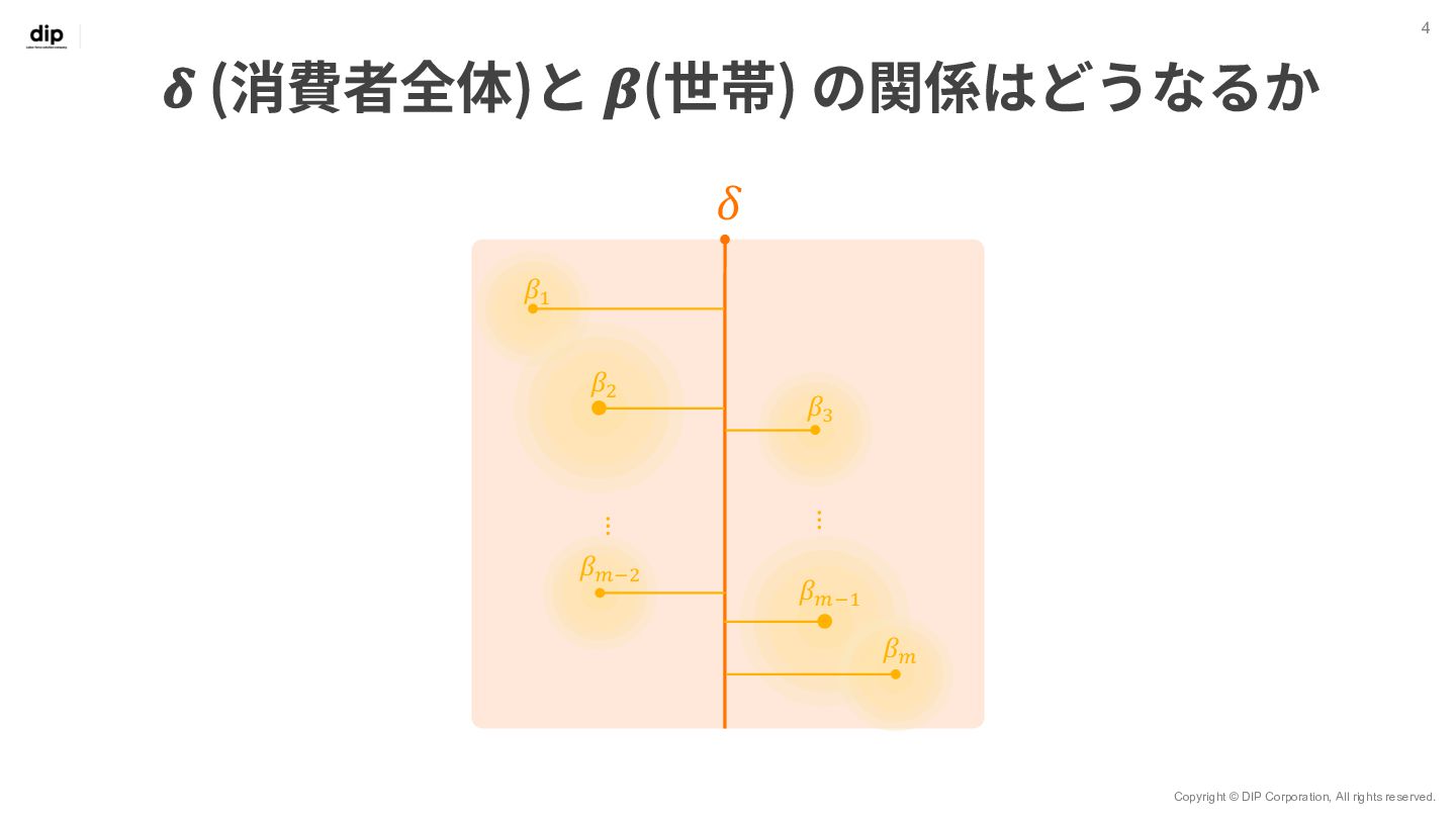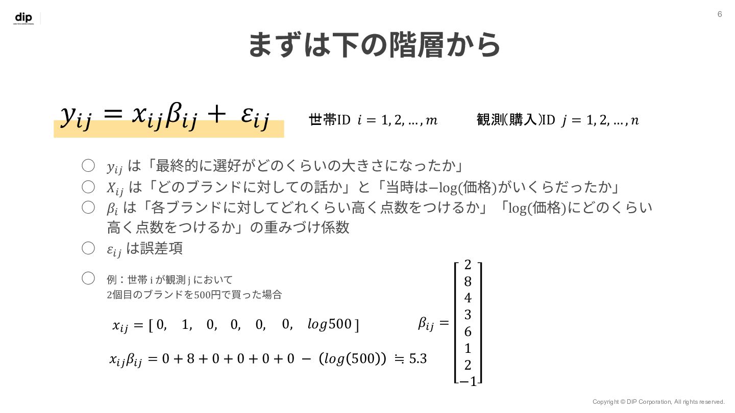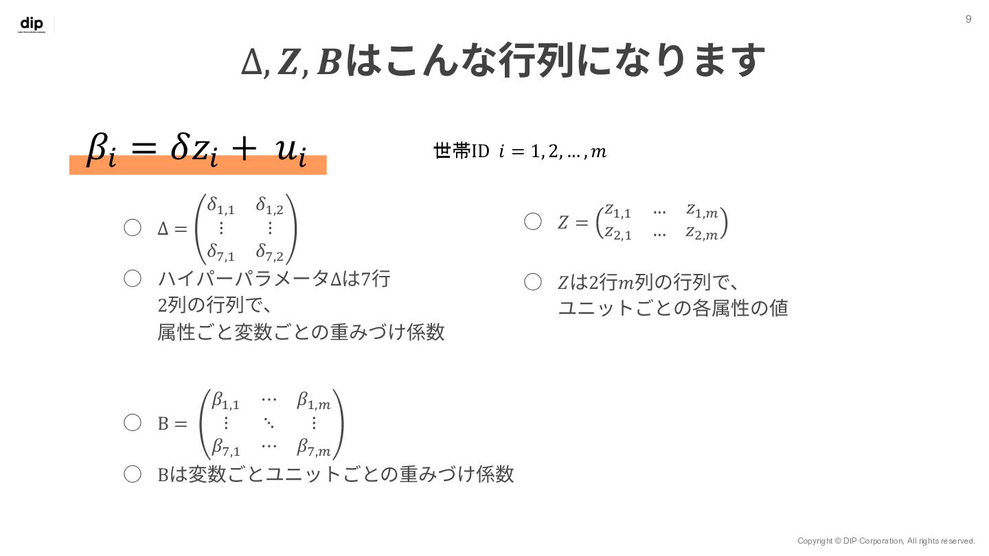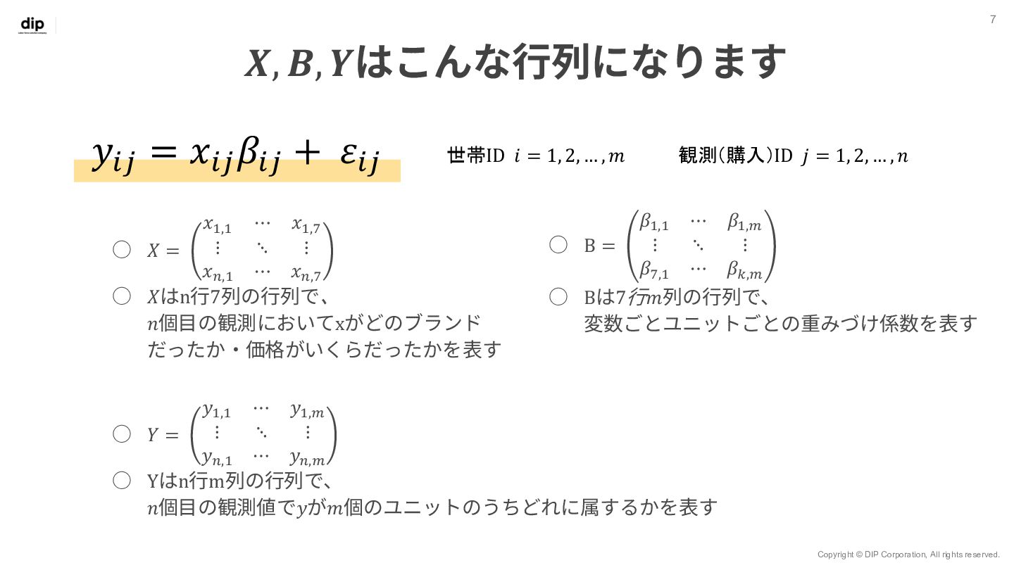 7 𝑦!" = 𝑥!" 𝛽!" + 𝜀!" 世帯ID 𝑖 = 1, 2, … , 𝑚 観測 (購入) ID 𝑗 = 1, 2, … , 𝑛 ◦ Β = 𝛽!,! ⋯ 𝛽!,$ ⋮ ⋱ ⋮ 𝛽.,! ⋯ 𝛽/,$ ◦ Βは7⾏𝑚列の⾏列で、 変数ごとユニットごとの重みづけ係数を表す ◦ 𝑋 = 𝑥!,! ⋯ 𝑥!,. ⋮ ⋱ ⋮ 𝑥0,! ⋯ 𝑥0,. ◦ 𝑋はn⾏7列の⾏列で、 𝑛個⽬の観測においてxがどのブランド だったか‧価格がいくらだったかを表す ◦ 𝑌 = 𝑦!,! ⋯ 𝑦!,$ ⋮ ⋱ ⋮ 𝑦0,! ⋯ 𝑦0,$ ◦ Yはn⾏m列の⾏列で、 𝑛個⽬の観測値で𝑦が𝑚個のユニットのうちどれに属するかを表す