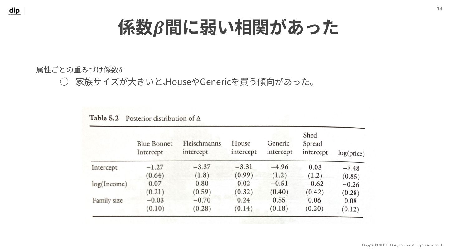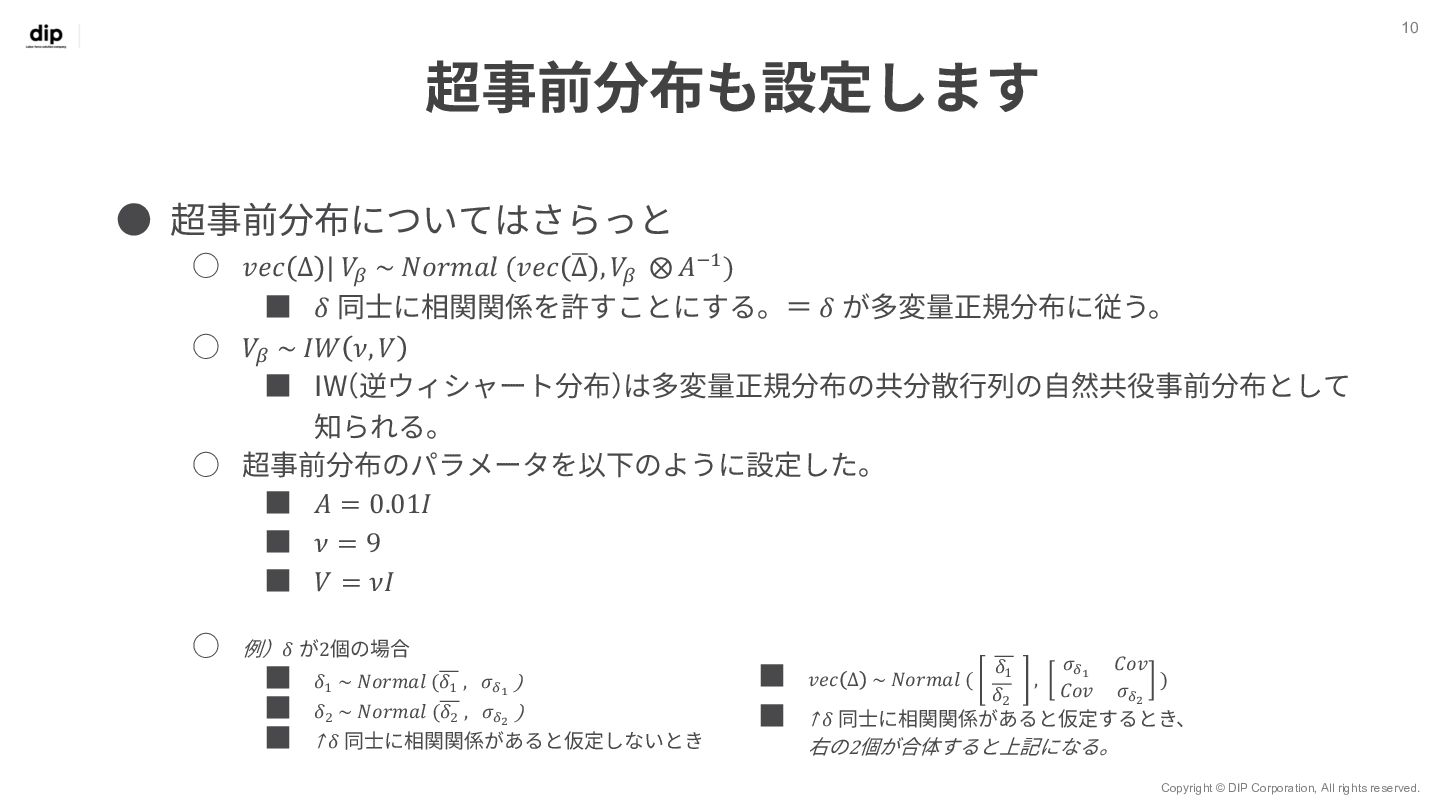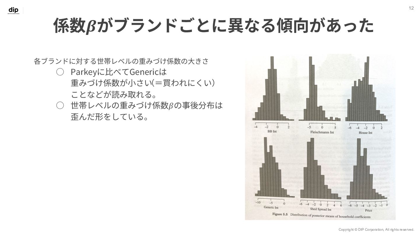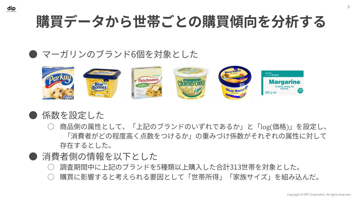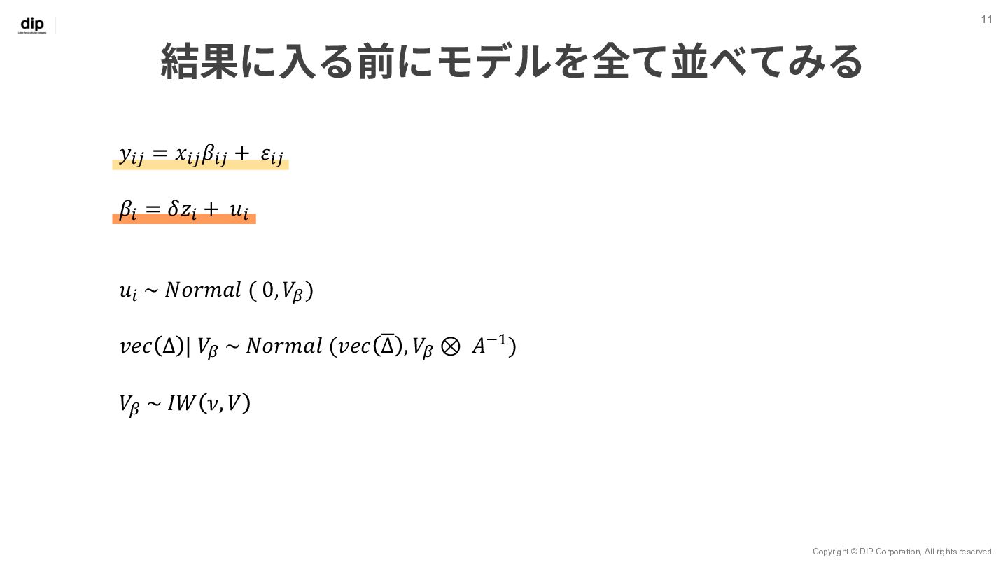 7 𝑦!" = 𝑥!" 𝛽!" + 𝜀!" 世帯ID 𝑖 = 1, 2, … , 𝑚 観測 (購入) ID 𝑗 = 1, 2, … , 𝑛 ◦ Β = 𝛽!,! ⋯ 𝛽!,$ ⋮ ⋱ ⋮ 𝛽.,! ⋯ 𝛽/,$ ◦ Βは7⾏𝑚列の⾏列で、 変数ごとユニットごとの重みづけ係数を表す ◦ 𝑋 = 𝑥!,! ⋯ 𝑥!,. ⋮ ⋱ ⋮ 𝑥0,! ⋯ 𝑥0,. ◦ 𝑋はn⾏7列の⾏列で、 𝑛個⽬の観測においてxがどのブランド だったか‧価格がいくらだったかを表す ◦ 𝑌 = 𝑦!,! ⋯ 𝑦!,$ ⋮ ⋱ ⋮ 𝑦0,! ⋯ 𝑦0,$ ◦ Yはn⾏m列の⾏列で、 𝑛個⽬の観測値で𝑦が𝑚個のユニットのうちどれに属するかを表す