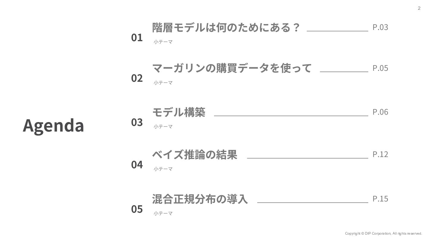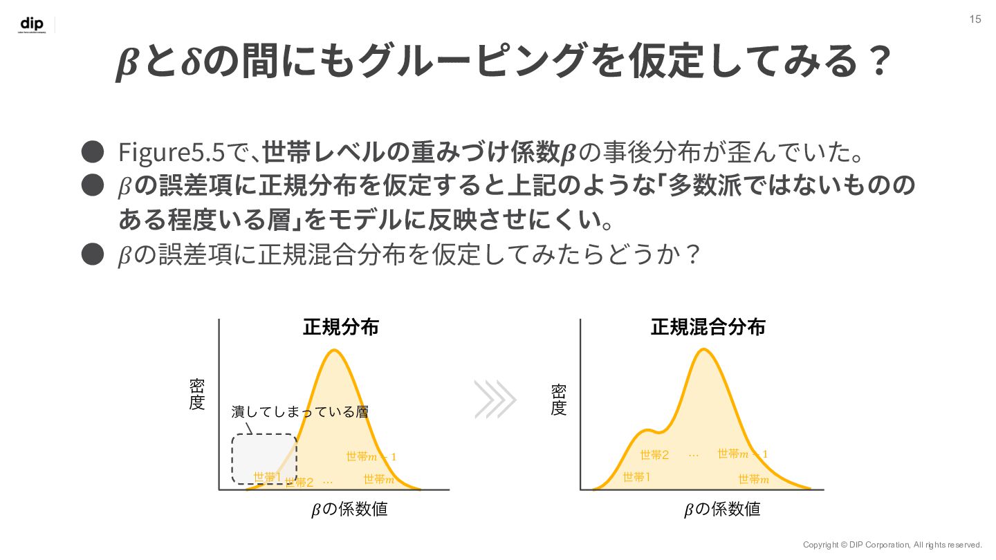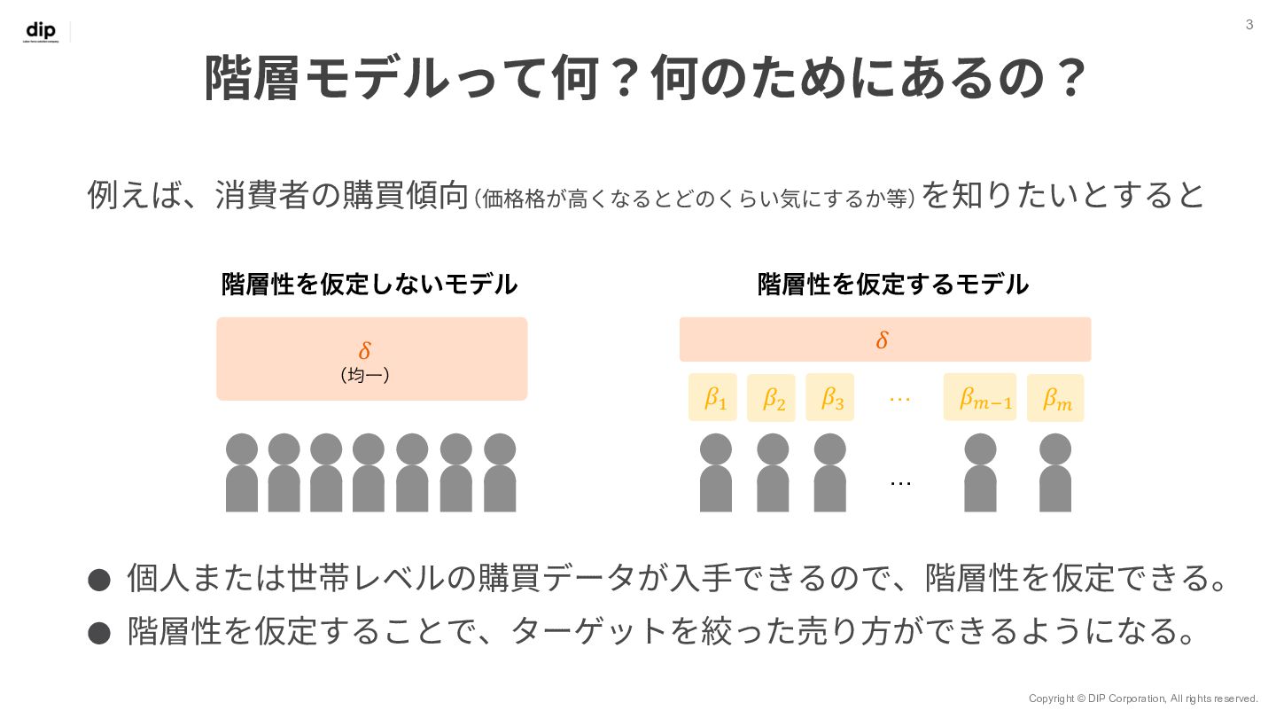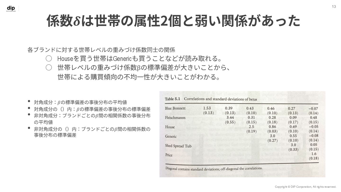 7 𝑦!" = 𝑥!" 𝛽!" + 𝜀!" 世帯ID 𝑖 = 1, 2, … , 𝑚 観測 (購入) ID 𝑗 = 1, 2, … , 𝑛 ◦ Β = 𝛽!,! ⋯ 𝛽!,$ ⋮ ⋱ ⋮ 𝛽.,! ⋯ 𝛽/,$ ◦ Βは7⾏𝑚列の⾏列で、 変数ごとユニットごとの重みづけ係数を表す ◦ 𝑋 = 𝑥!,! ⋯ 𝑥!,. ⋮ ⋱ ⋮ 𝑥0,! ⋯ 𝑥0,. ◦ 𝑋はn⾏7列の⾏列で、 𝑛個⽬の観測においてxがどのブランド だったか‧価格がいくらだったかを表す ◦ 𝑌 = 𝑦!,! ⋯ 𝑦!,$ ⋮ ⋱ ⋮ 𝑦0,! ⋯ 𝑦0,$ ◦ Yはn⾏m列の⾏列で、 𝑛個⽬の観測値で𝑦が𝑚個のユニットのうちどれに属するかを表す