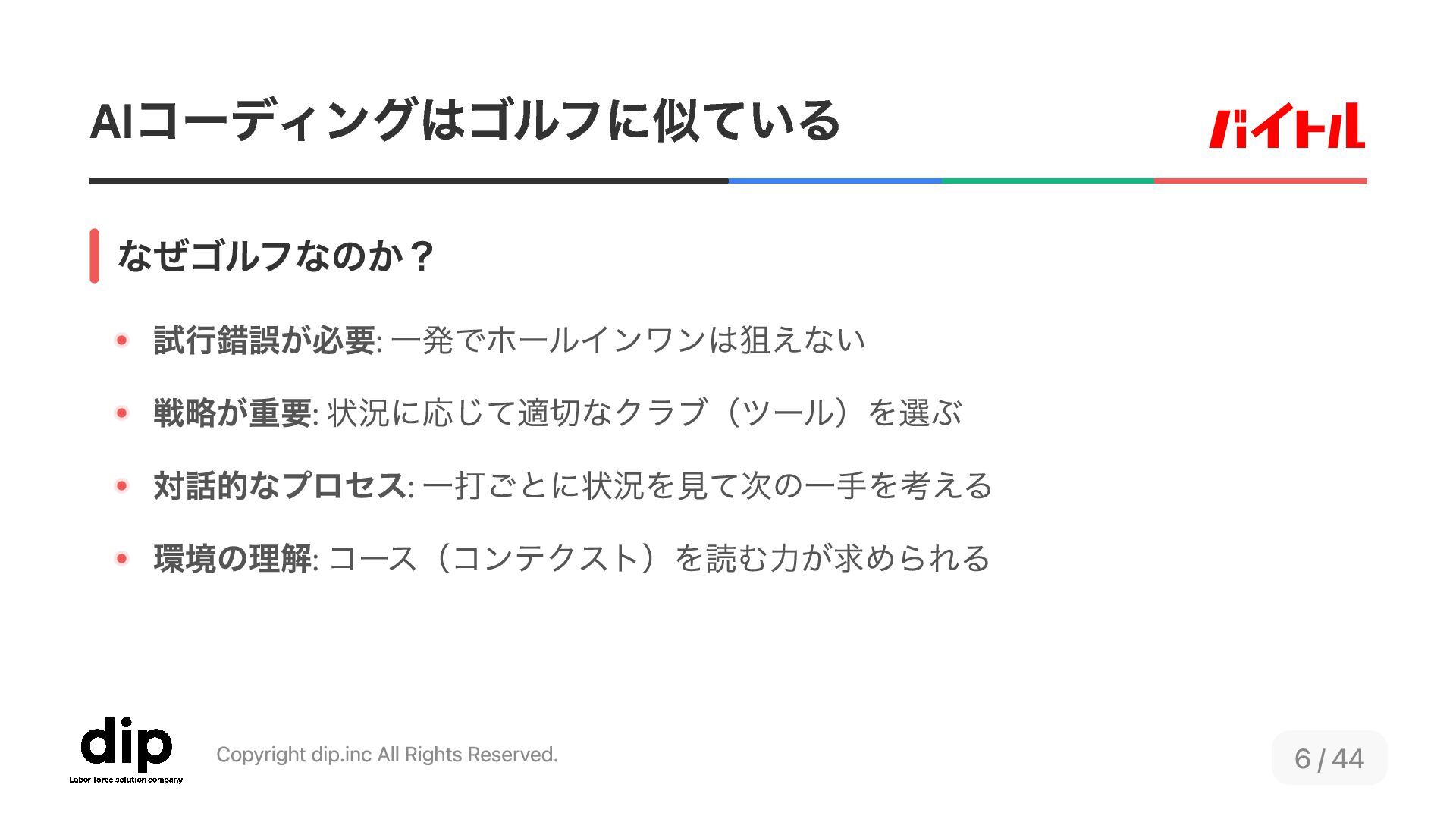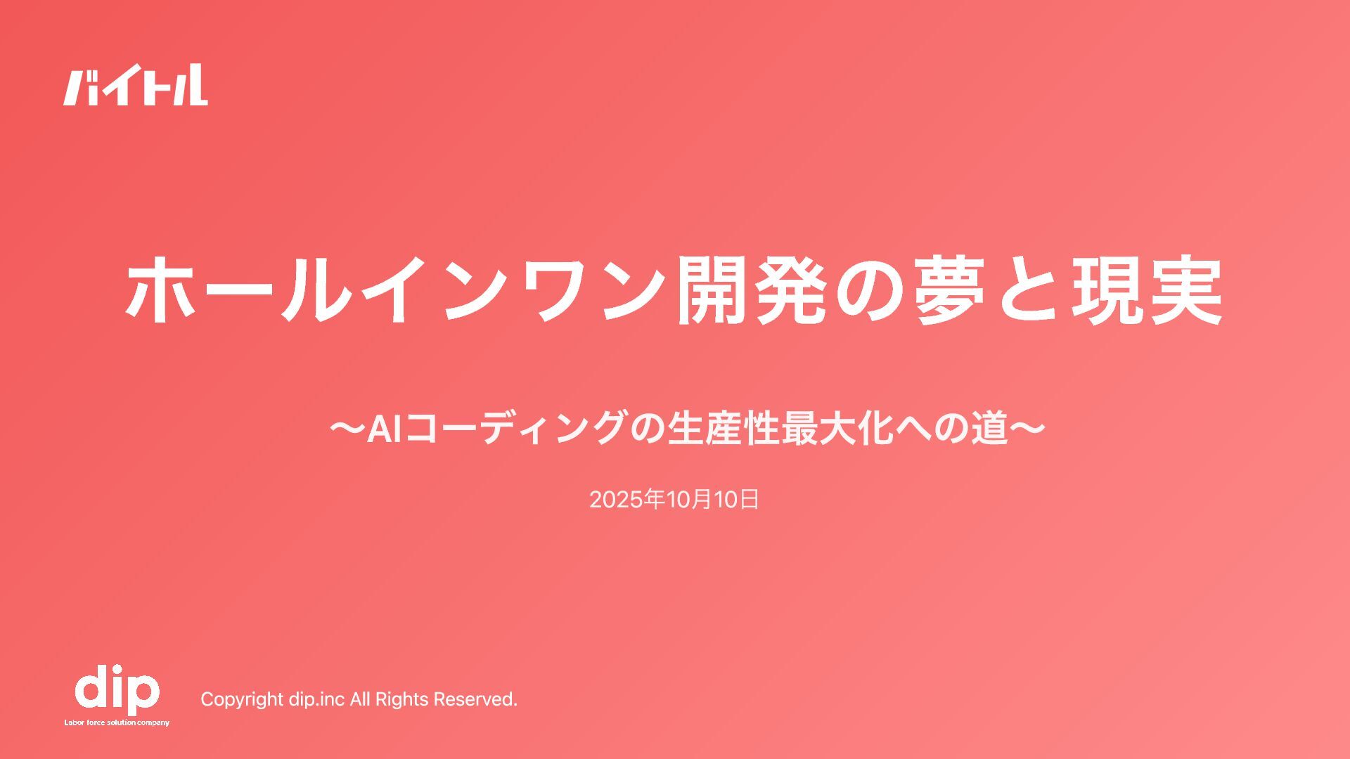 ホールインワン開発の夢と現実 〜AIコーディングの生産性最大化への道〜 2025年10月10日 Copyright dip.inc All Rights Reserved.