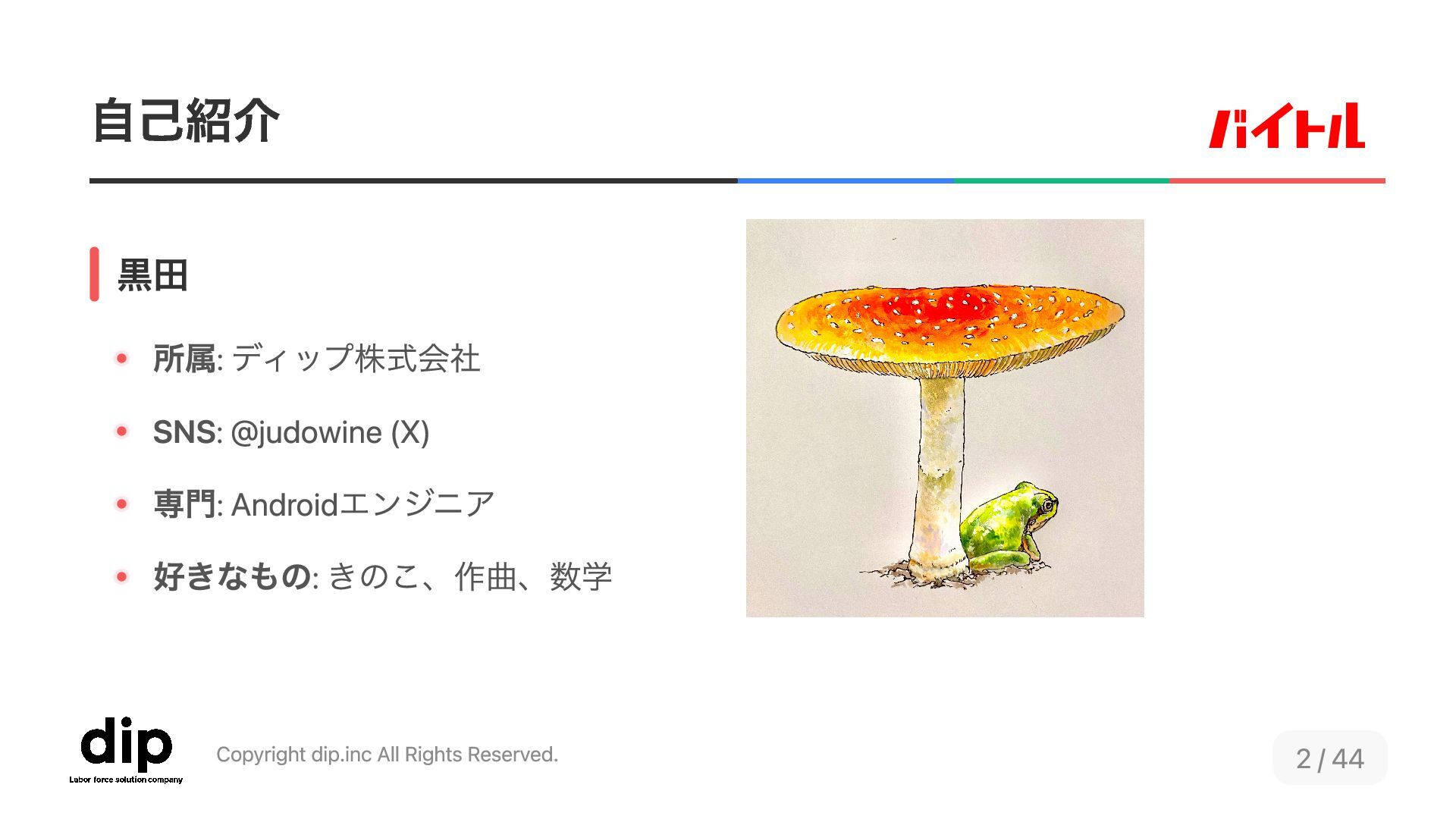 自己紹介 黒田 所属: ディップ株式会社 SNS: @judowine (X) 専門: Androidエンジニア 好きなもの: