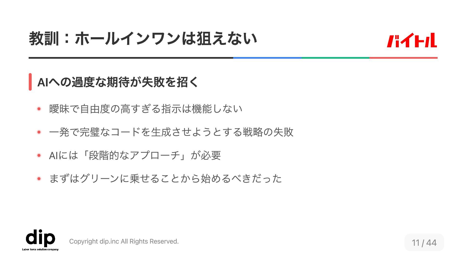 教訓:ホールインワンは狙えない AIへの過度な期待が失敗を招く 曖昧で自由度の高すぎる指示は機能しない 一発で完璧なコードを生成させようとする戦略の失敗 AIには「段階的なアプローチ」が必要 まずはグリーンに乗せることから始めるべきだった Copyright dip.inc All Rights