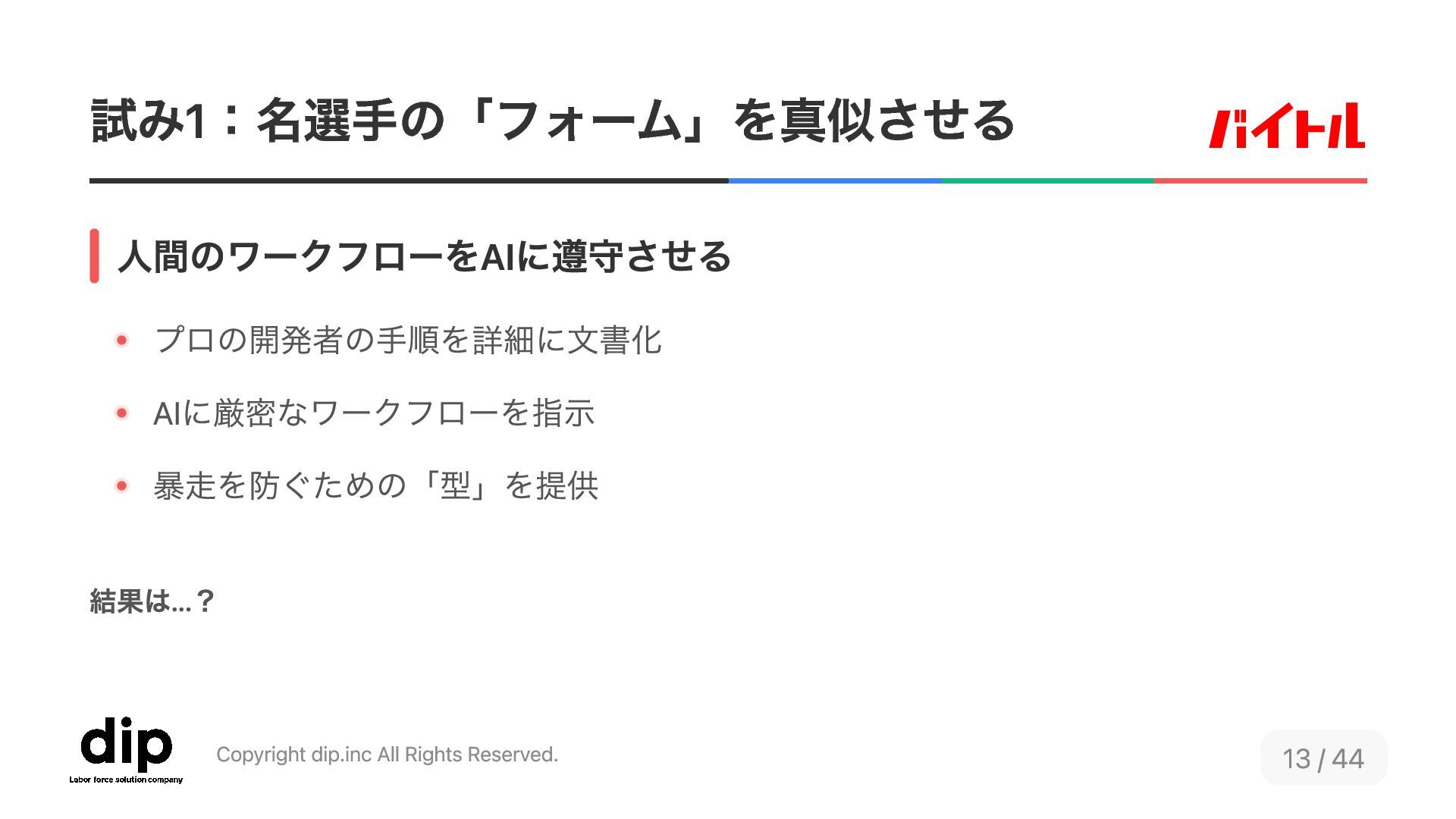 結果は...? 試み1:名選手の「フォーム」を真似させる 人間のワークフローをAIに遵守させる プロの開発者の手順を詳細に文書化 AIに厳密なワークフローを指示 暴走を防ぐための「型」を提供 Copyright dip.inc All Rights
