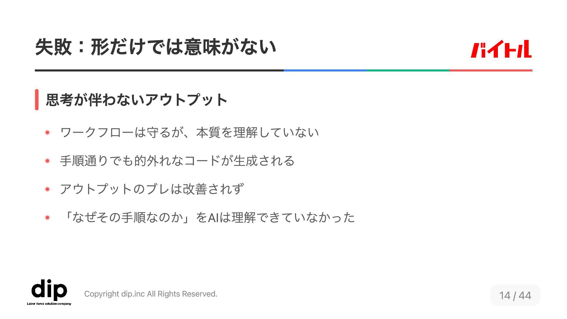 失敗:形だけでは意味がない 思考が伴わないアウトプット ワークフローは守るが、本質を理解していない 手順通りでも的外れなコードが生成される アウトプットのブレは改善されず 「なぜその手順なのか」をAIは理解できていなかった Copyright dip.inc All Rights