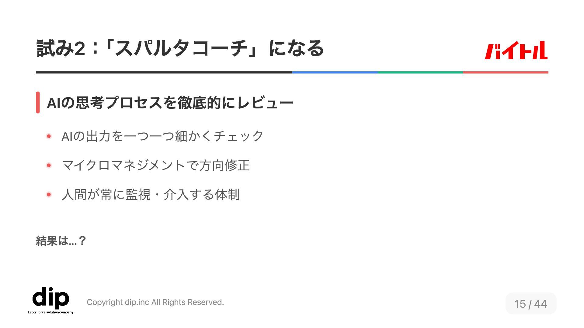 結果は...? 試み2: 「スパルタコーチ」になる AIの思考プロセスを徹底的にレビュー AIの出力を一つ一つ細かくチェック マイクロマネジメントで方向修正 人間が常に監視・介入する体制 Copyright dip.inc All