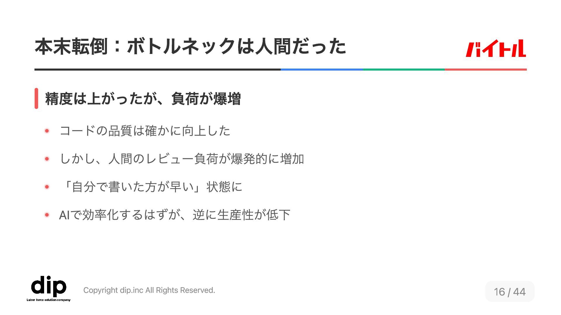 本末転倒:ボトルネックは人間だった 精度は上がったが、負荷が爆増 コードの品質は確かに向上した しかし、人間のレビュー負荷が爆発的に増加 「自分で書いた方が早い」状態に AIで効率化するはずが、逆に生産性が低下 Copyright dip.inc All Rights