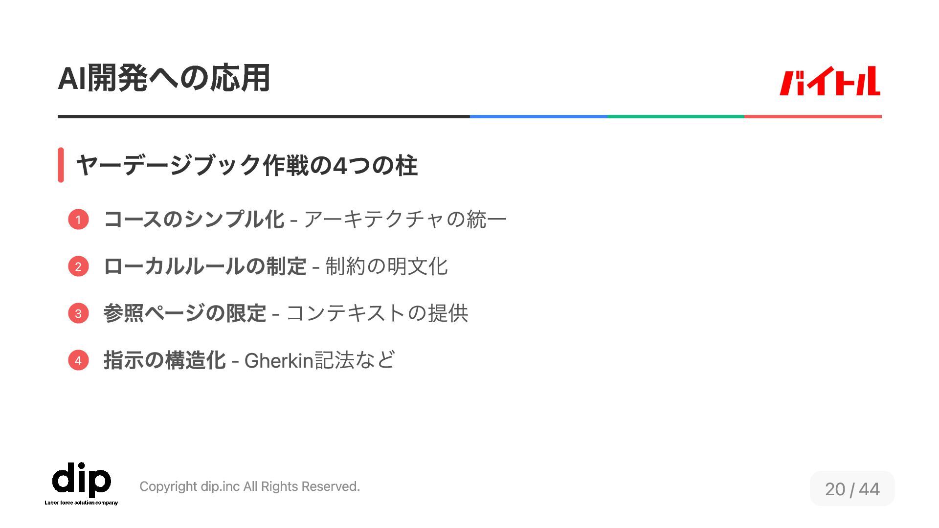参照ページの限定 - コンテキストの提供 3 指示の構造化 - Gherkin記法など 4 Copyright dip.inc All Rights Reserved. 20 / 44