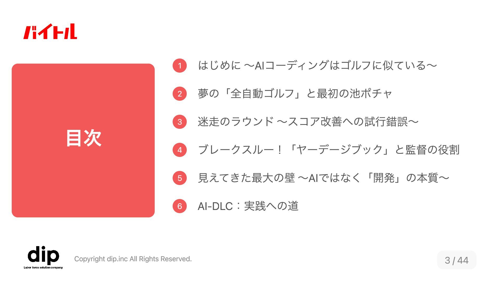 4 見えてきた最大の壁 〜AIではなく「開発」の本質〜 5 AI-DLC:実践への道 6 Copyright dip.inc All Rights Reserved. 3 / 44