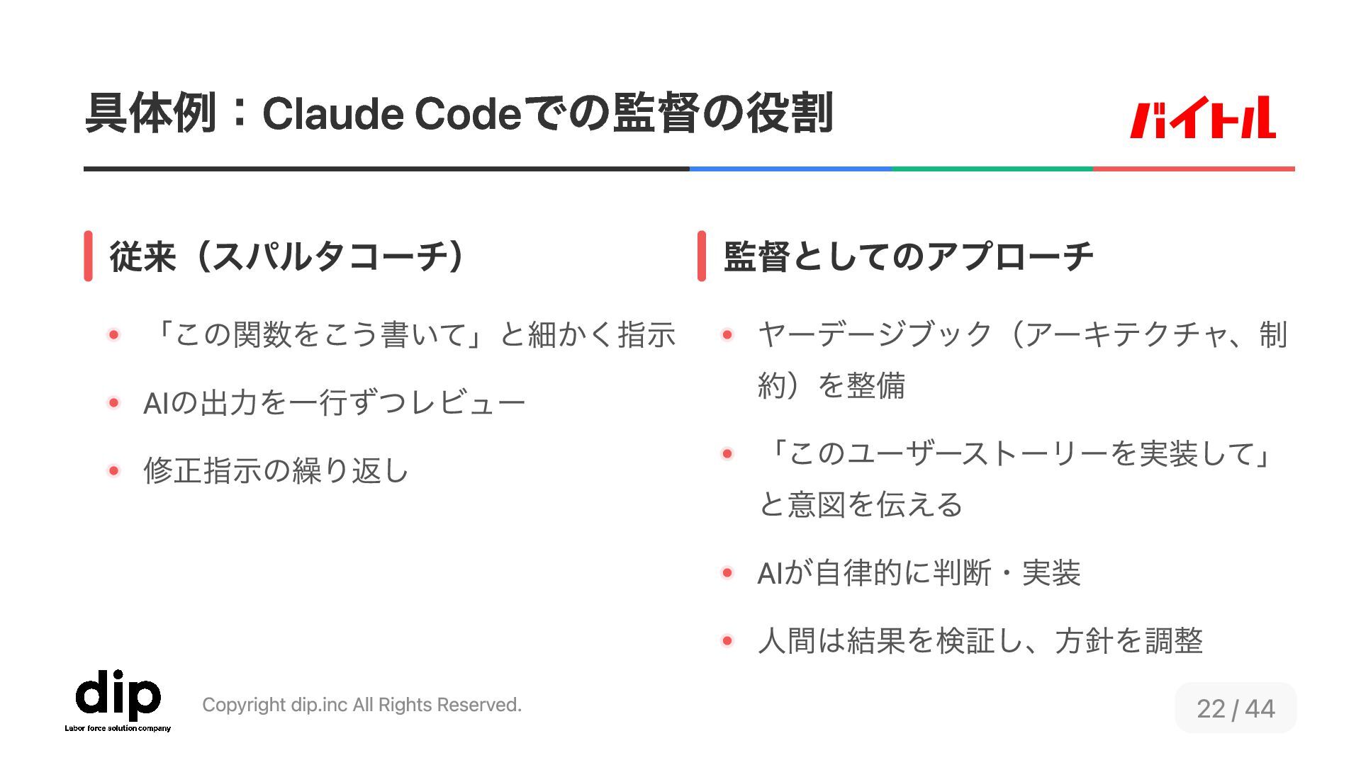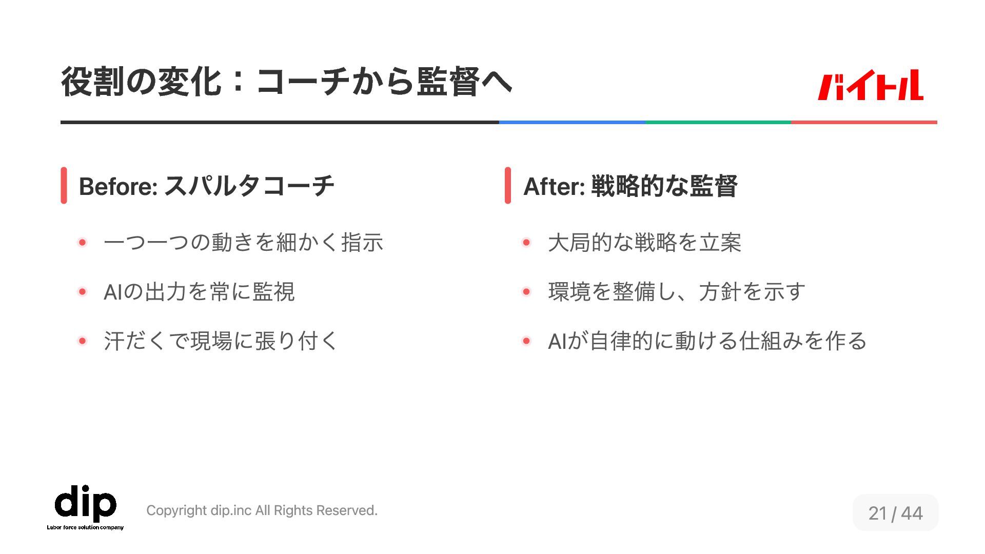 役割の変化:コーチから監督へ Before: スパルタコーチ 一つ一つの動きを細かく指示 AIの出力を常に監視 汗だくで現場に張り付く After: 戦略的な監督 大局的な戦略を立案 環境を整備し、方針を示す