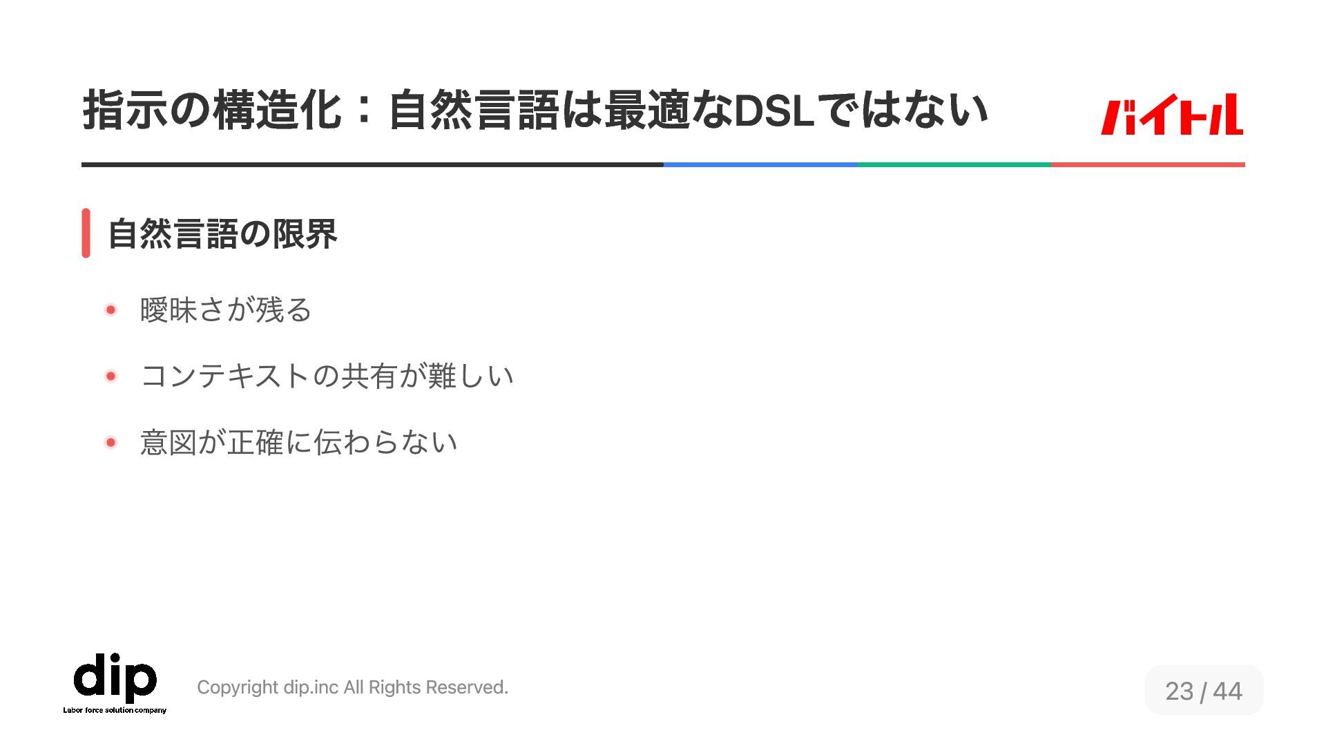 指示の構造化:自然言語は最適なDSLではない 自然言語の限界 曖昧さが残る コンテキストの共有が難しい 意図が正確に伝わらない Copyright dip.inc All Rights Reserved.
