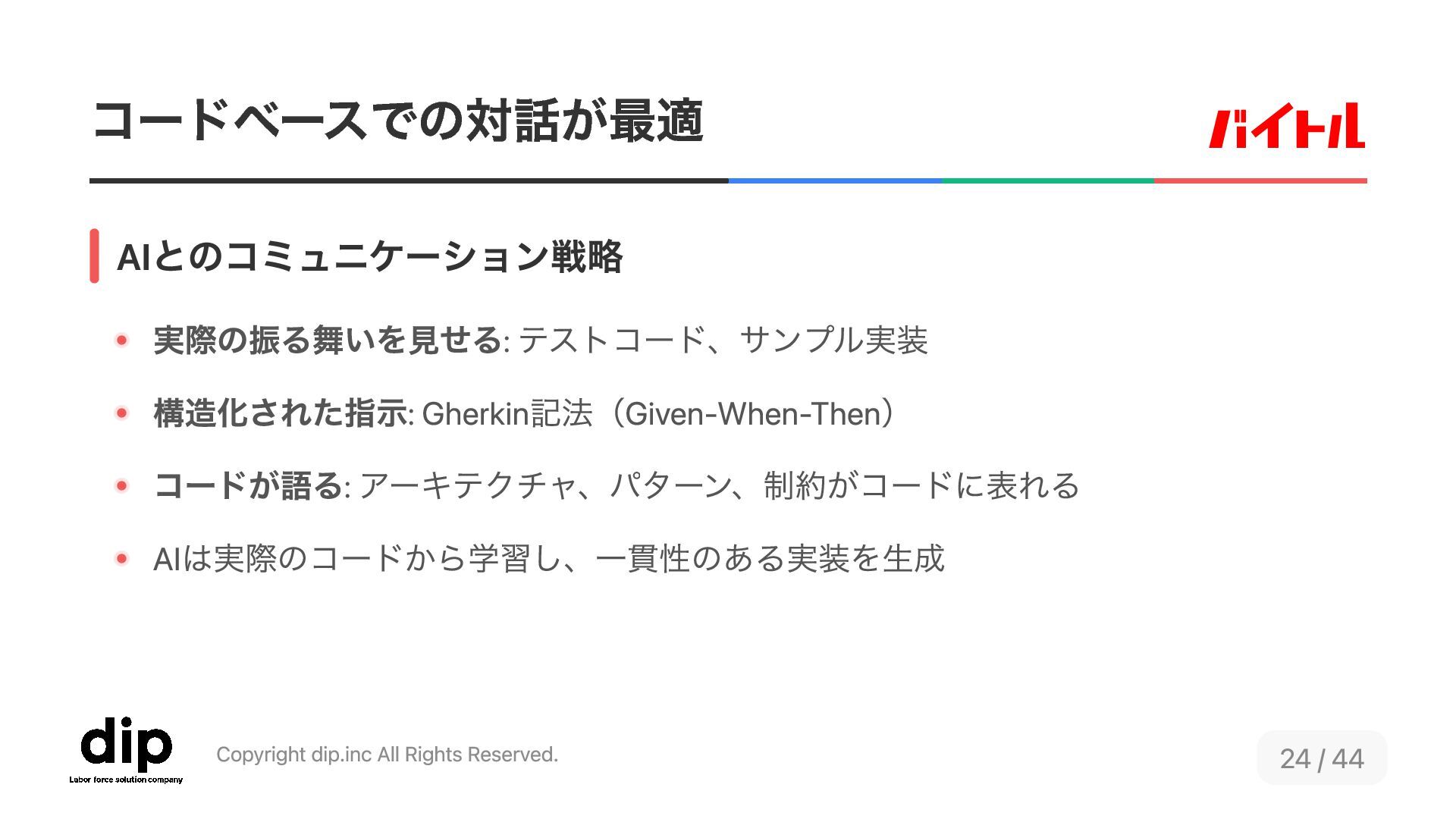 コードベースでの対話が最適 AIとのコミュニケーション戦略 実際の振る舞いを見せる: テストコード、サンプル実装 構造化された指示: Gherkin記法(Given-When-Then) コードが語る: アーキテクチャ、パターン、制約がコードに表れる AIは実際のコードから学習し、一貫性のある実装を生成 Copyright