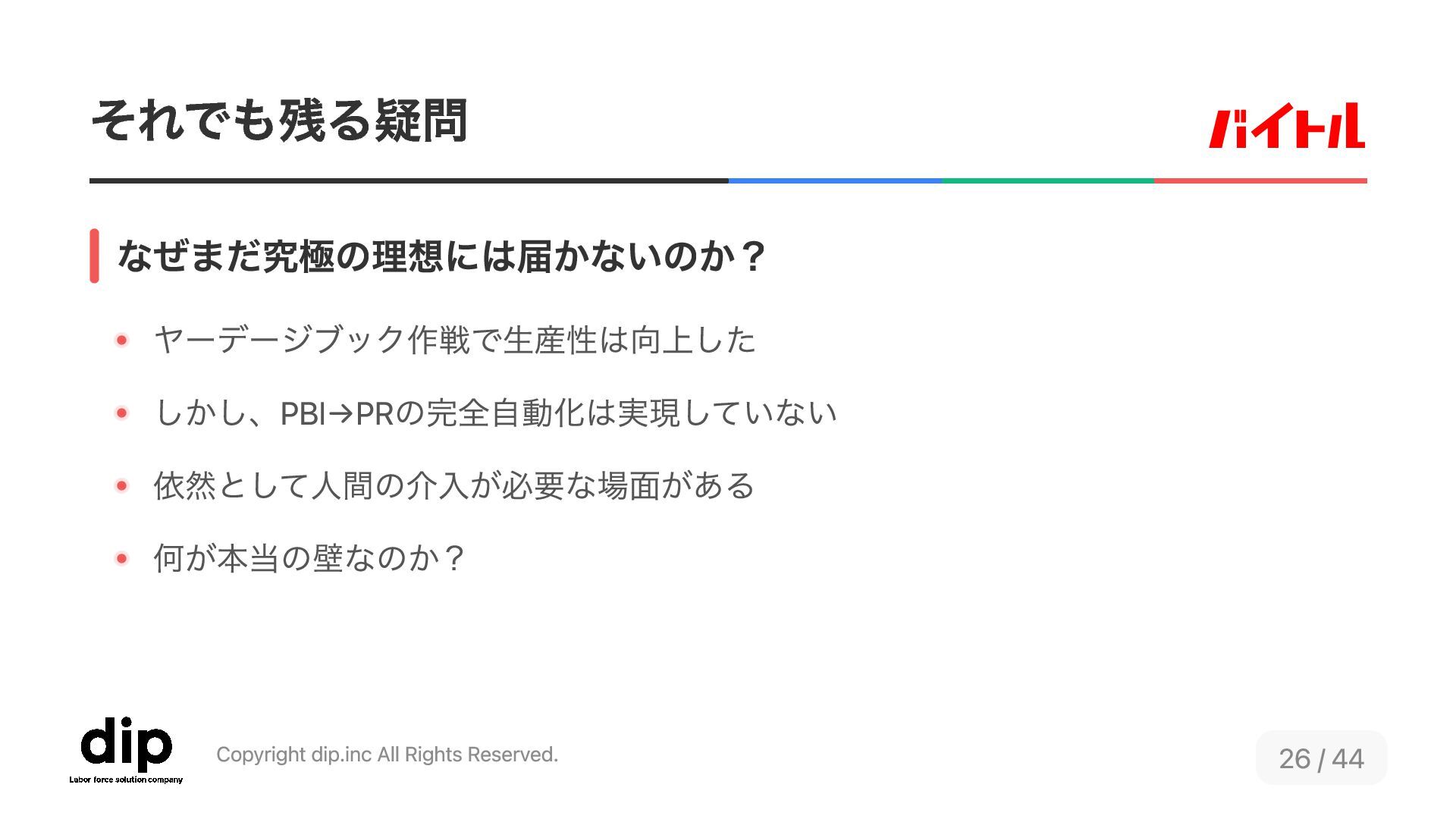 それでも残る疑問 なぜまだ究極の理想には届かないのか? ヤーデージブック作戦で生産性は向上した しかし、PBI→PRの完全自動化は実現していない 依然として人間の介入が必要な場面がある 何が本当の壁なのか? Copyright dip.inc All Rights