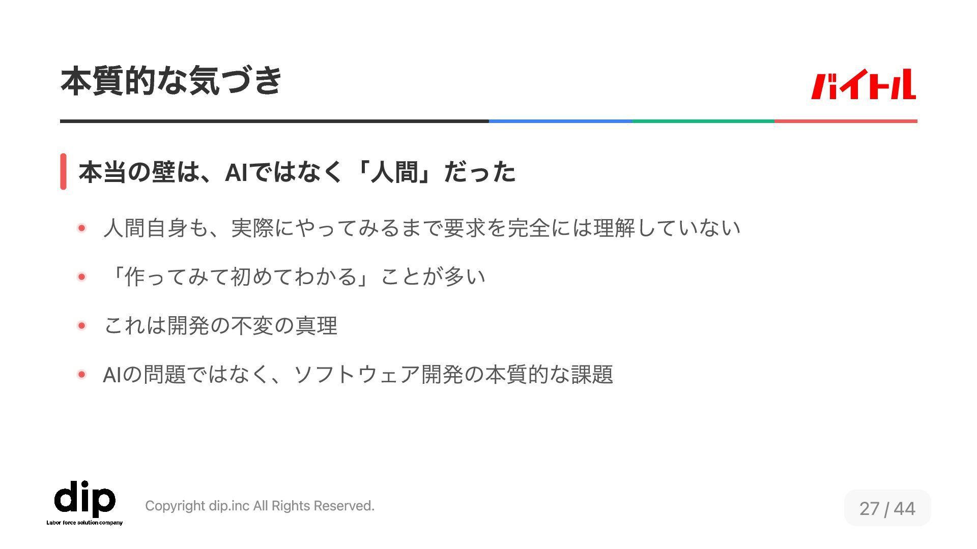本質的な気づき 本当の壁は、AIではなく「人間」だった 人間自身も、実際にやってみるまで要求を完全には理解していない 「作ってみて初めてわかる」ことが多い これは開発の不変の真理 AIの問題ではなく、ソフトウェア開発の本質的な課題 Copyright dip.inc All Rights