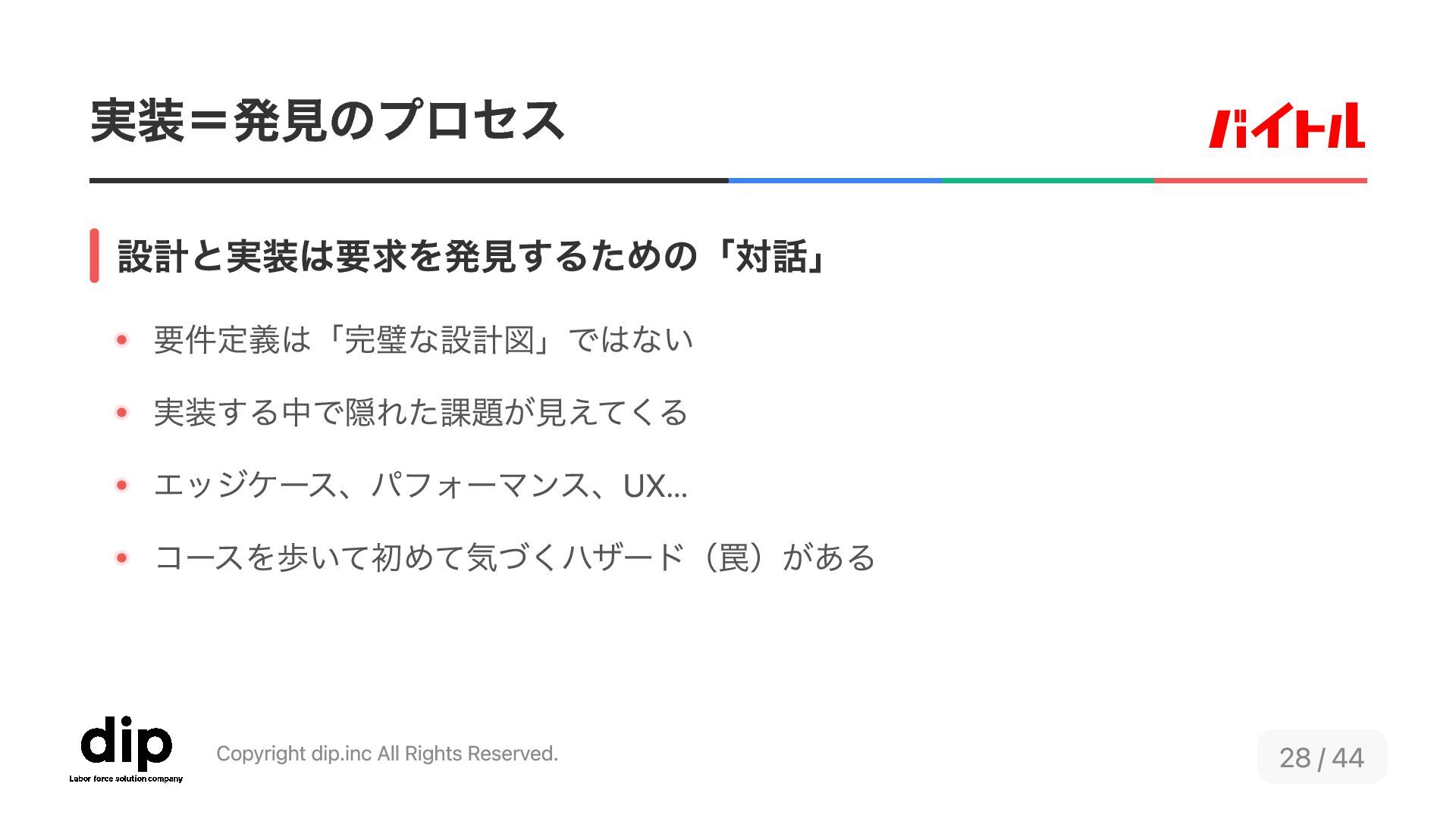 実装=発見のプロセス 設計と実装は要求を発見するための「対話」 要件定義は「完璧な設計図」ではない 実装する中で隠れた課題が見えてくる エッジケース、パフォーマンス、UX... コースを歩いて初めて気づくハザード(罠)がある Copyright dip.inc All Rights