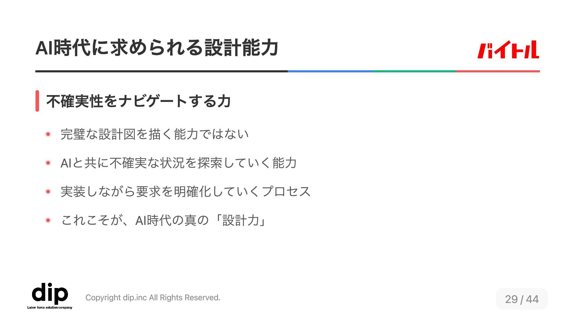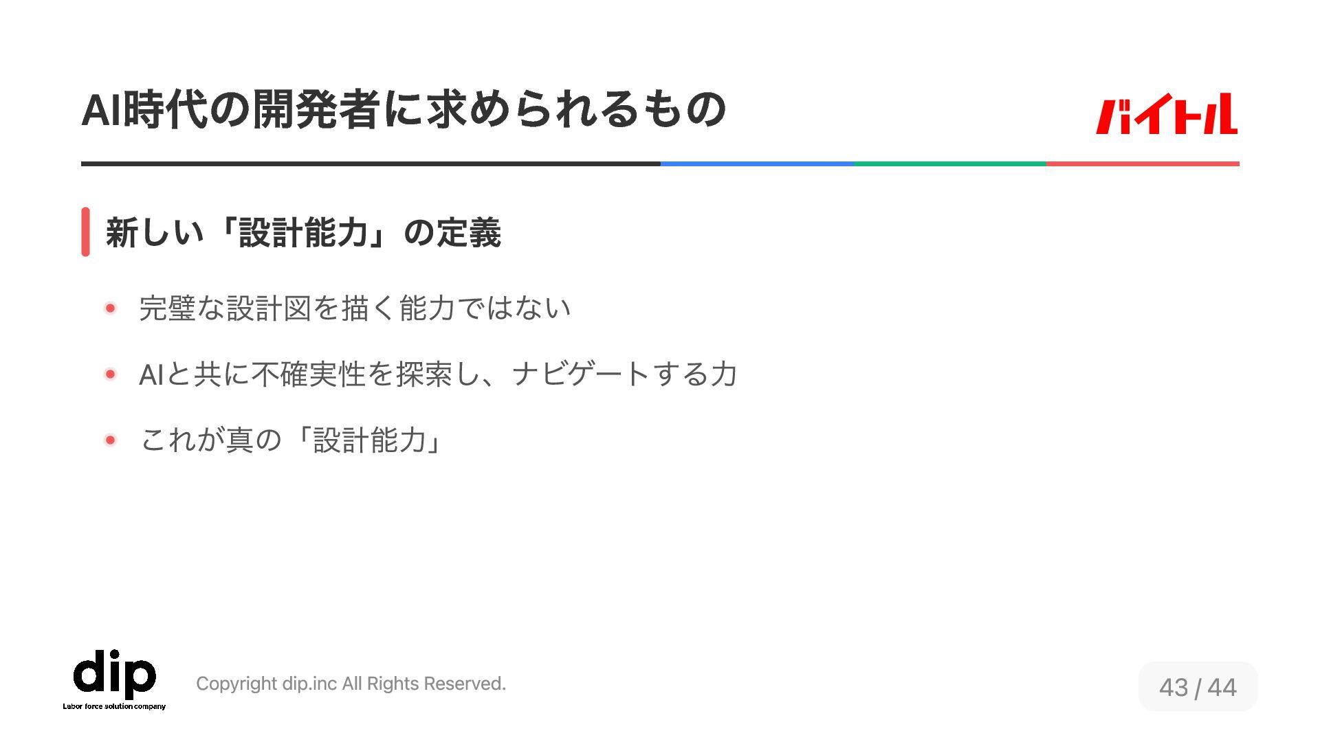 AI時代の開発者に求められるもの 新しい「設計能力」の定義 完璧な設計図を描く能力ではない AIと共に不確実性を探索し、ナビゲートする力 これが真の「設計能力」 Copyright dip.inc All Rights Reserved.