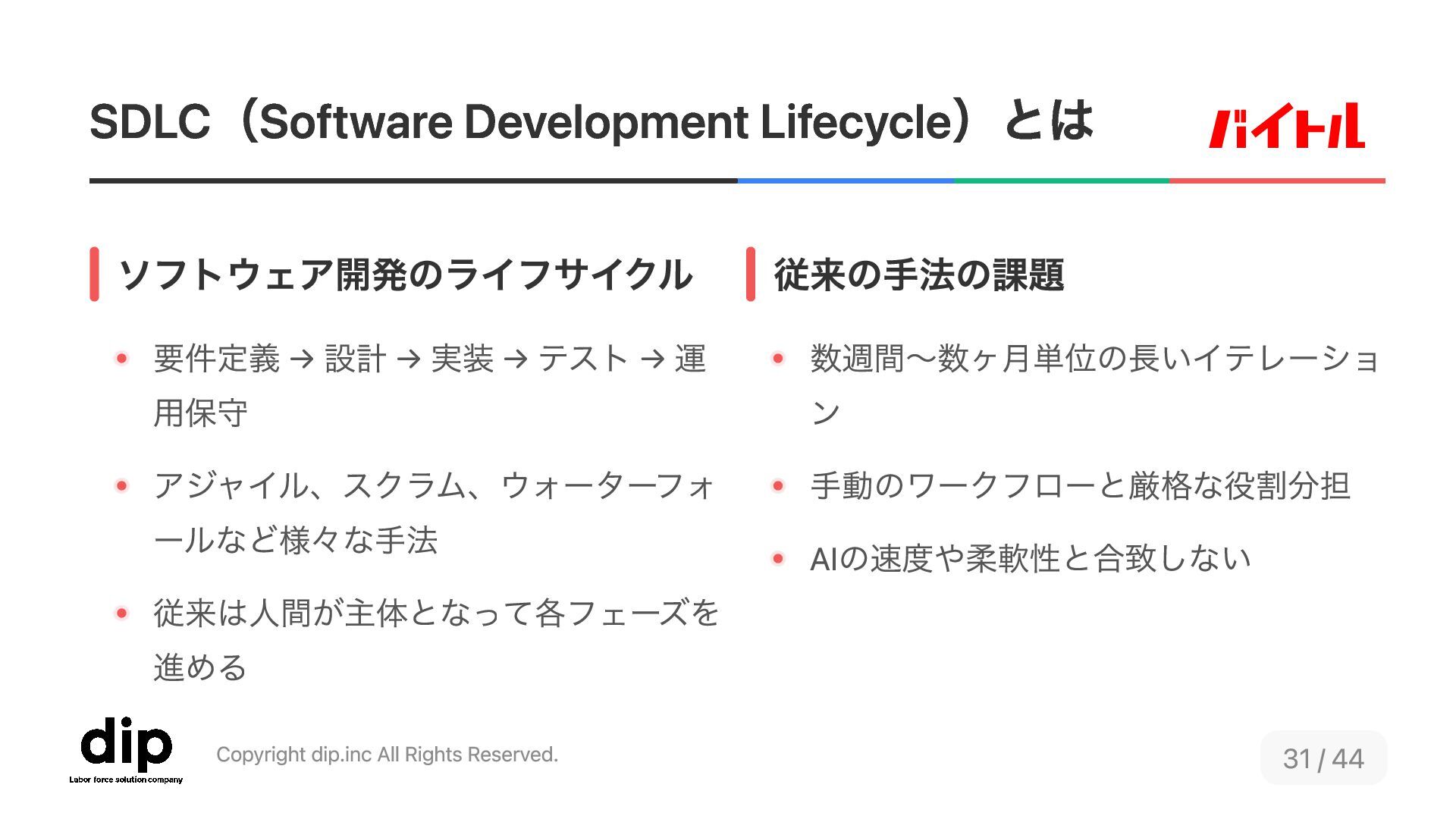 テスト → 運 用保守 アジャイル、スクラム、ウォーターフォ ールなど様々な手法 従来は人間が主体となって各フェーズを 進める 従来の手法の課題 数週間〜数ヶ月単位の長いイテレーショ ン 手動のワークフローと厳格な役割分担 AIの速度や柔軟性と合致しない Copyright dip.inc All Rights Reserved. 31 / 44