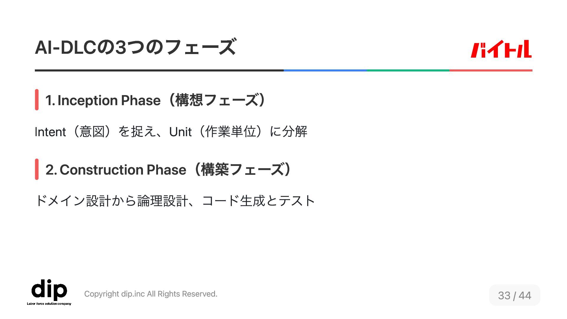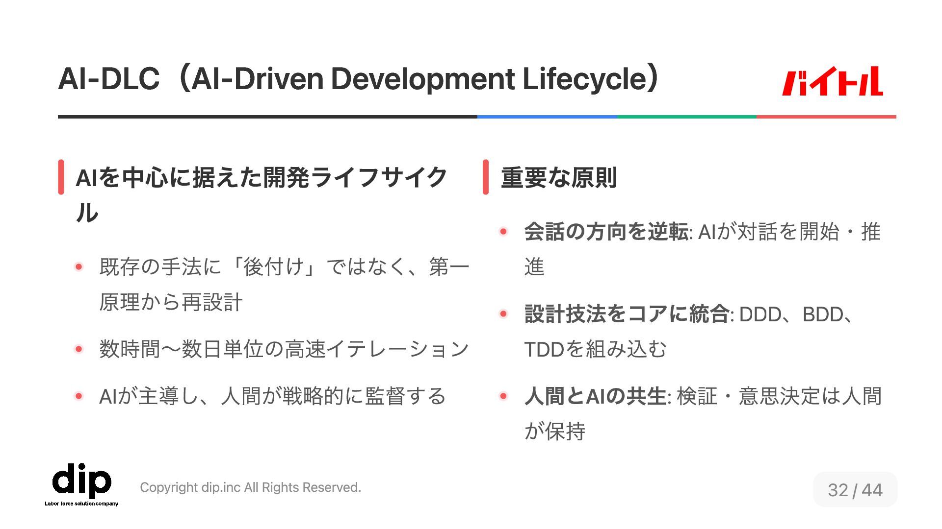 会話の方向を逆転: AIが対話を開始・推 進 設計技法をコアに統合: DDD、BDD、 TDDを組み込む 人間とAIの共生: 検証・意思決定は人間 が保持 Copyright dip.inc All Rights Reserved. 32 / 44