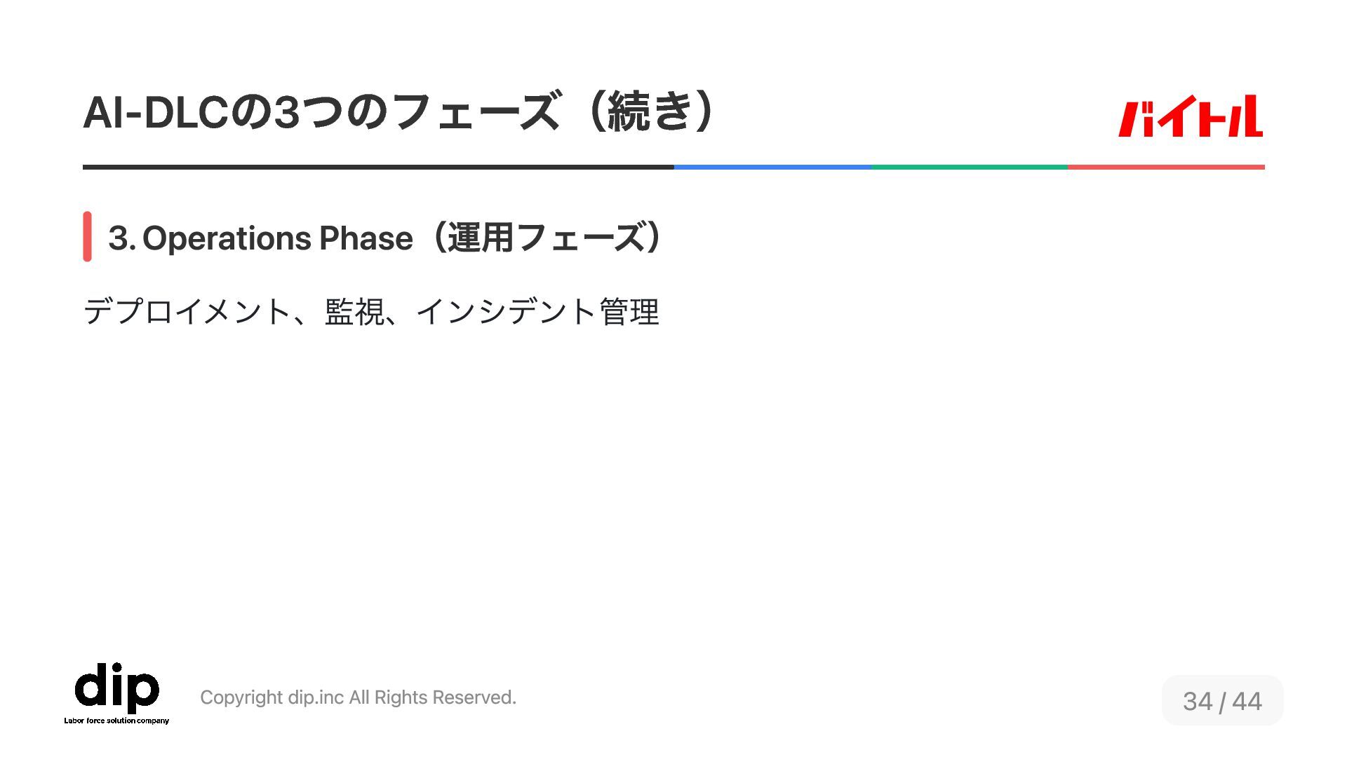 デプロイメント、監視、インシデント管理 AI-DLCの3つのフェーズ(続き) 3. Operations Phase(運用フェーズ) Copyright dip.inc All Rights Reserved.