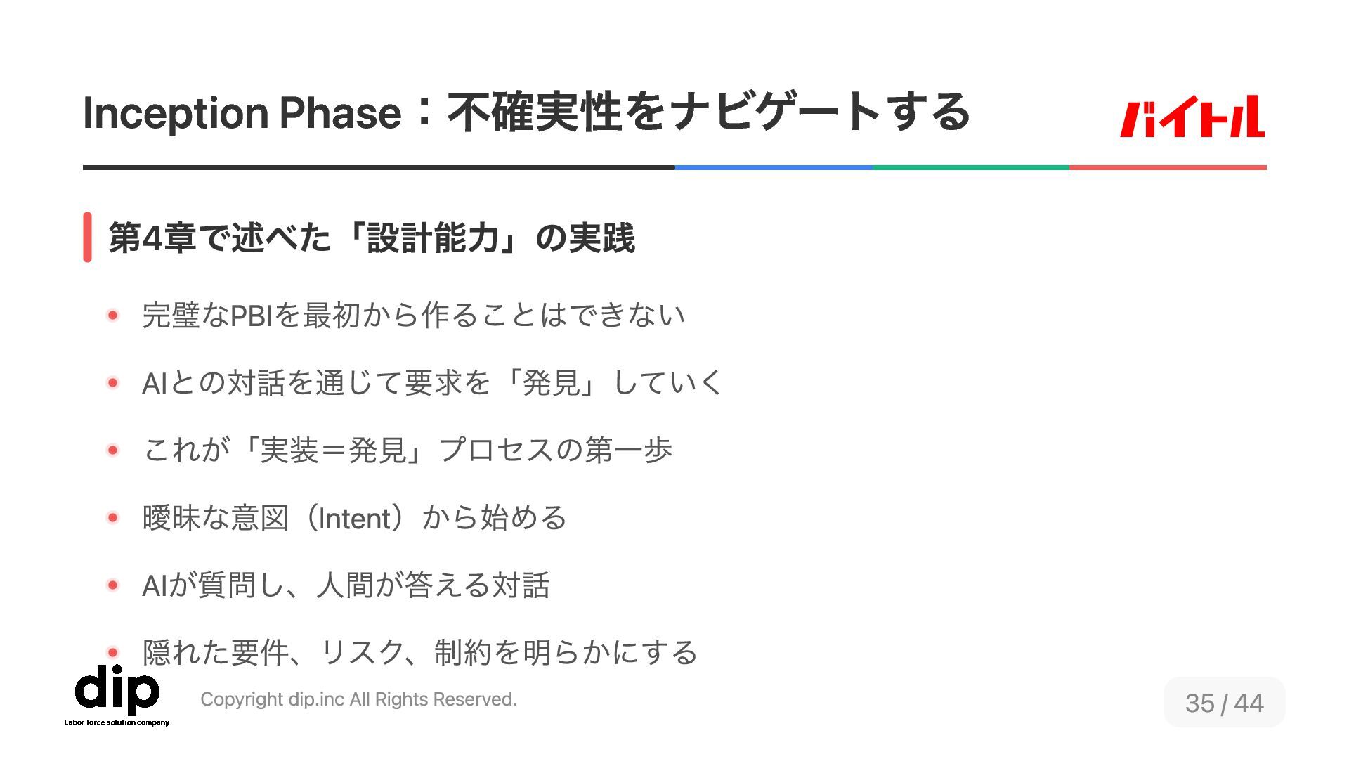 AI時代に求められる設計能力 不確実性をナビゲートする力 完璧な設計図を描く能力ではない AIと共に不確実な状況を探索していく能力 実装しながら要求を明確化していくプロセス これこそが、AI時代の真の「設計力」 Copyright dip.inc All Rights