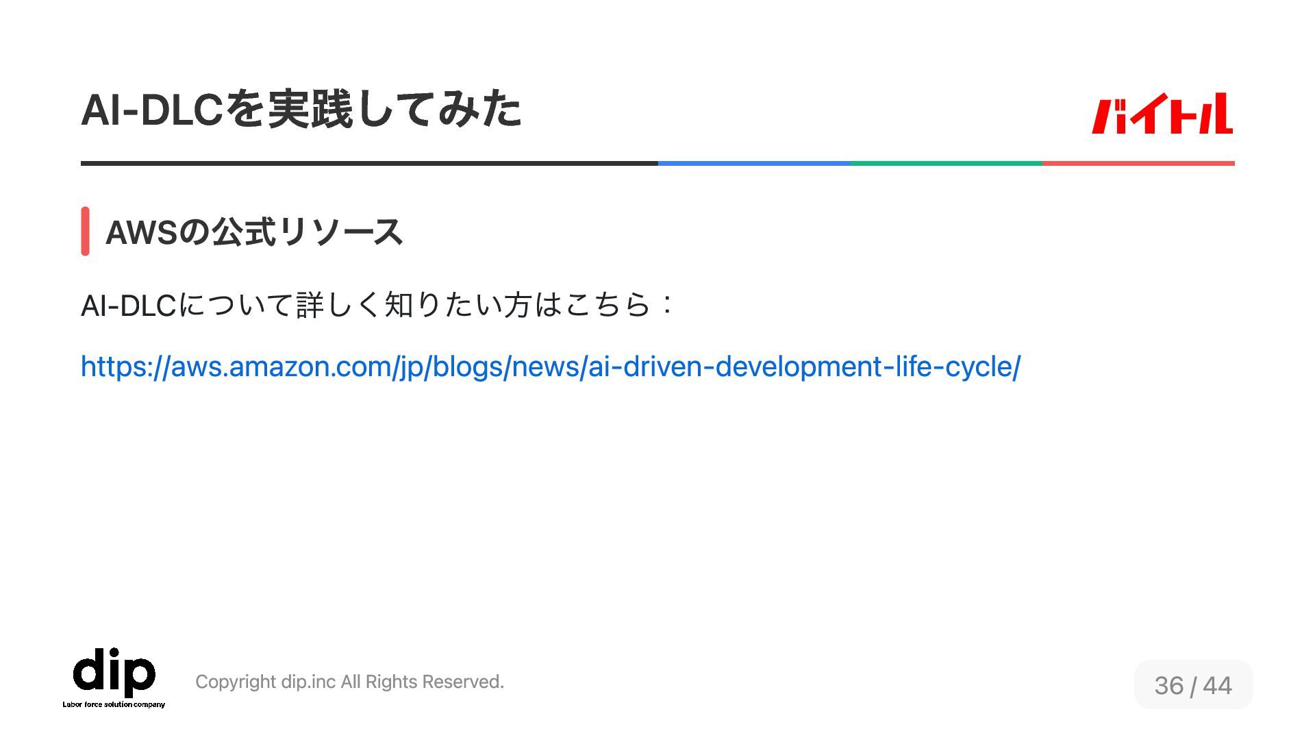 AI-DLCについて詳しく知りたい方はこちら: https://aws.amazon.com/jp/blogs/news/ai-driven-development-life-cycle/ AI-DLCを実践してみた AWSの公式リソース Copyright dip.inc All Rights Reserved. 36