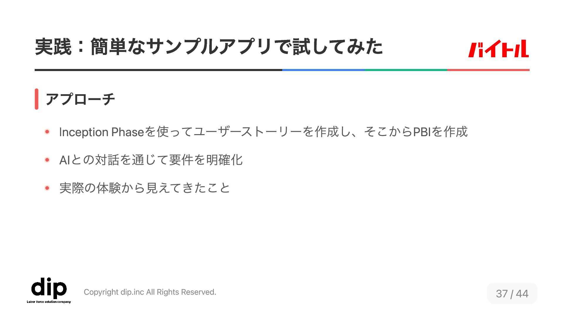 実践:簡単なサンプルアプリで試してみた アプローチ Inception Phaseを使ってユーザーストーリーを作成し、そこからPBIを作成 AIとの対話を通じて要件を明確化 実際の体験から見えてきたこと Copyright dip.inc All Rights