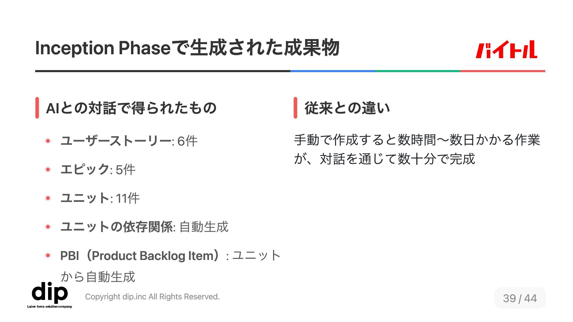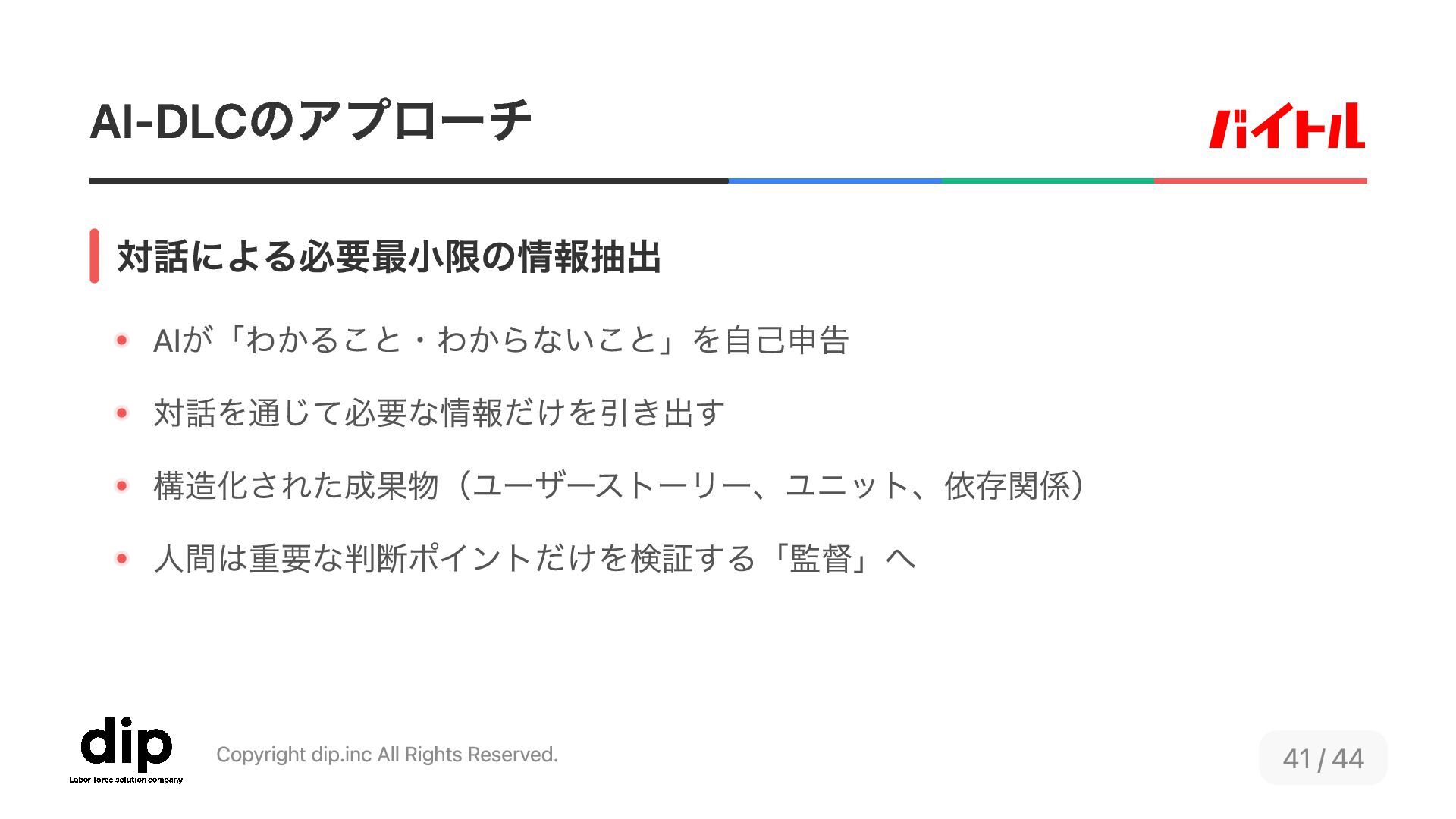 AI-DLCのアプローチ 対話による必要最小限の情報抽出 AIが「わかること・わからないこと」を自己申告 対話を通じて必要な情報だけを引き出す 構造化された成果物(ユーザーストーリー、ユニット、依存関係) 人間は重要な判断ポイントだけを検証する「監督」へ Copyright dip.inc All Rights