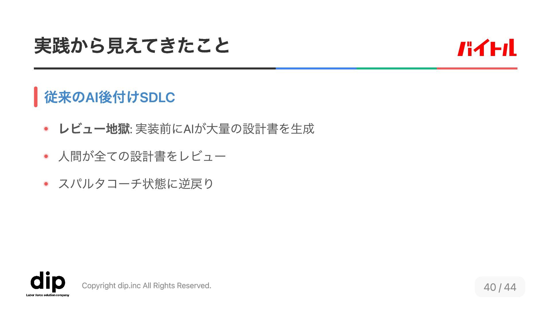 実践から見えてきたこと 従来のAI後付けSDLC レビュー地獄: 実装前にAIが大量の設計書を生成 人間が全ての設計書をレビュー スパルタコーチ状態に逆戻り Copyright dip.inc All Rights