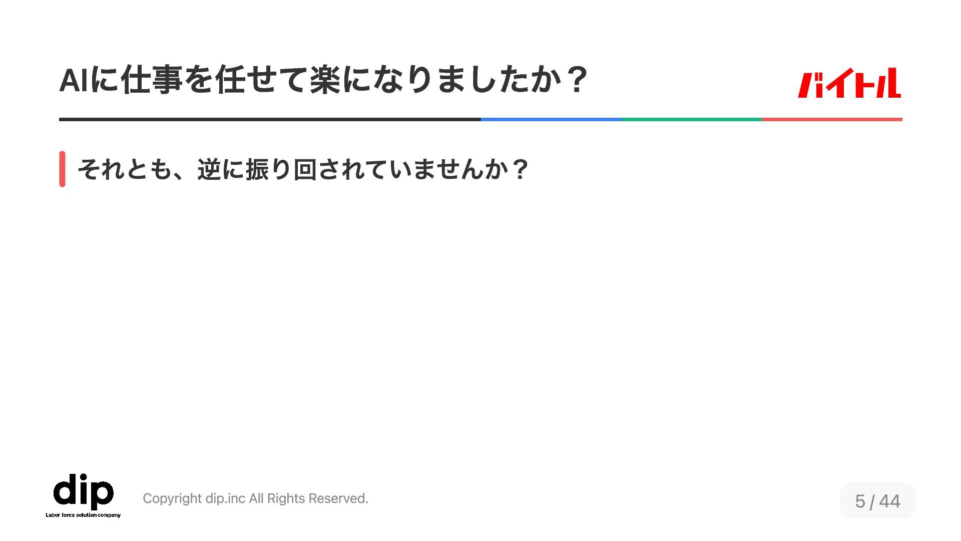 AIに仕事を任せて楽になりましたか? それとも、逆に振り回されていませんか? Copyright dip.inc All Rights Reserved. 5 / 44
