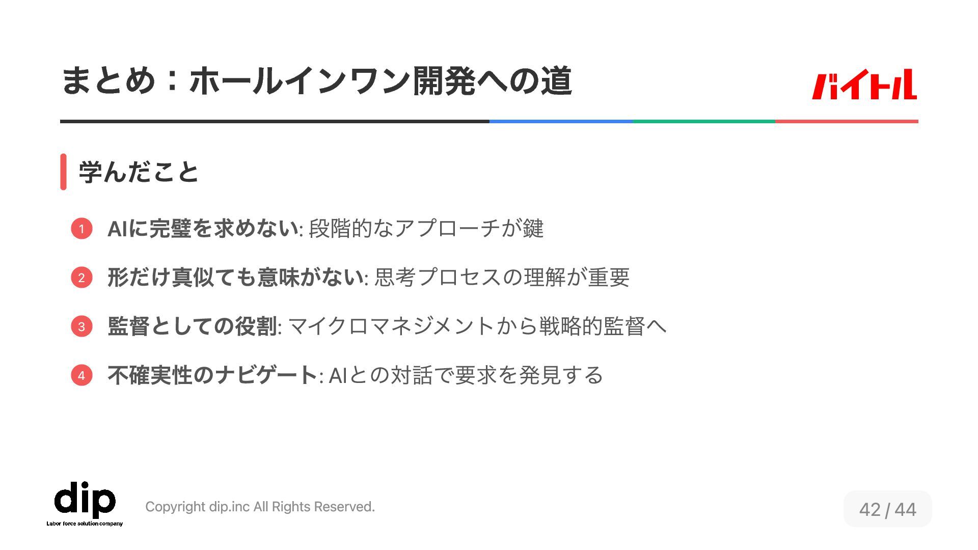 まとめ:ホールインワン開発への道 学んだこと AIに完璧を求めない: 段階的なアプローチが鍵 1 形だけ真似ても意味がない: 思考プロセスの理解が重要 2 監督としての役割: マイクロマネジメントから戦略的監督へ