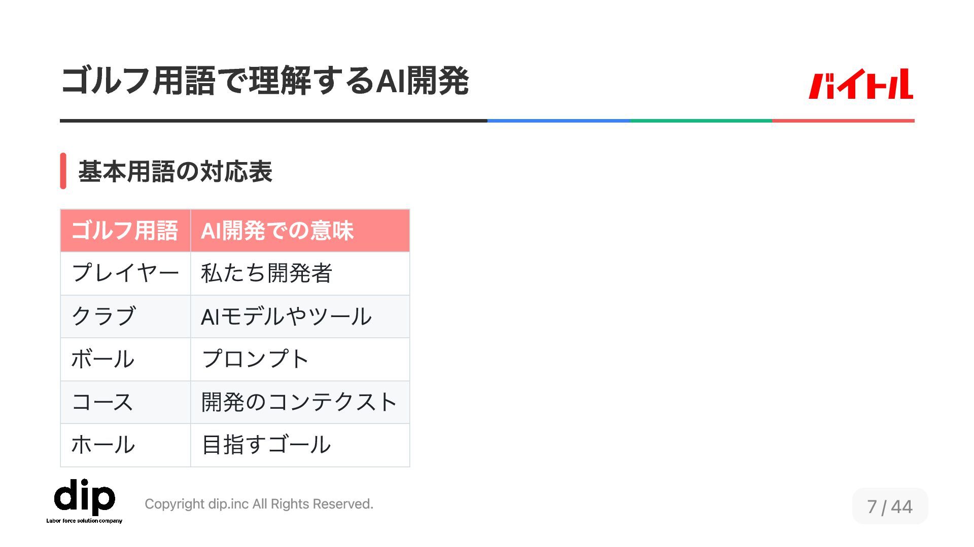 ホール 目指すゴール ゴルフ用語で理解するAI開発 基本用語の対応表 Copyright dip.inc All Rights Reserved. 7 / 44