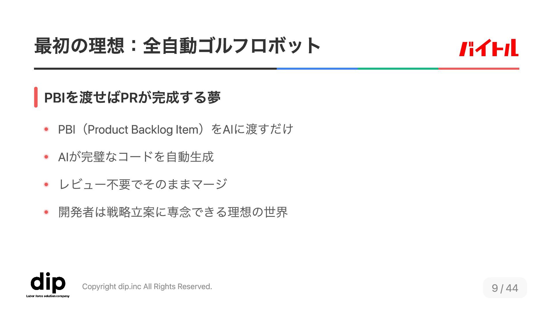 最初の理想:全自動ゴルフロボット PBIを渡せばPRが完成する夢 PBI(Product Backlog Item)をAIに渡すだけ AIが完璧なコードを自動生成 レビュー不要でそのままマージ 開発者は戦略立案に専念できる理想の世界 Copyright dip.inc