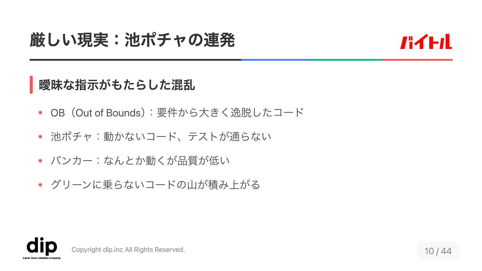 厳しい現実:池ポチャの連発 曖昧な指示がもたらした混乱 OB(Out of Bounds) :要件から大きく逸脱したコード 池ポチャ:動かないコード、テストが通らない バンカー:なんとか動くが品質が低い グリーンに乗らないコードの山が積み上がる Copyright