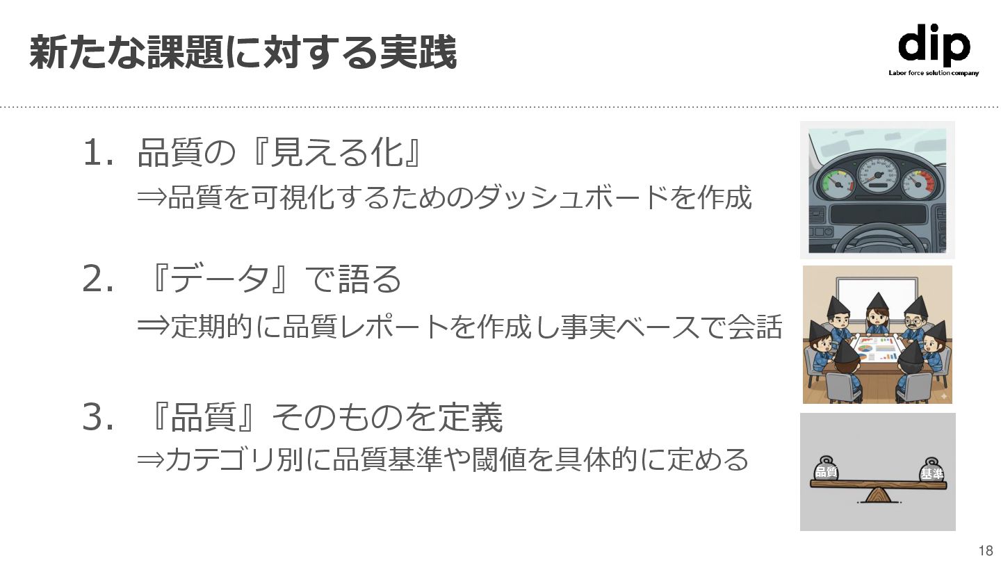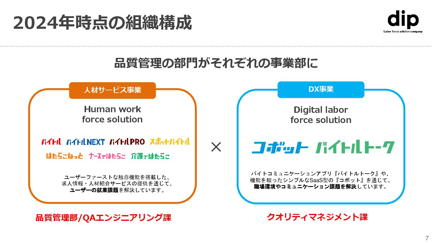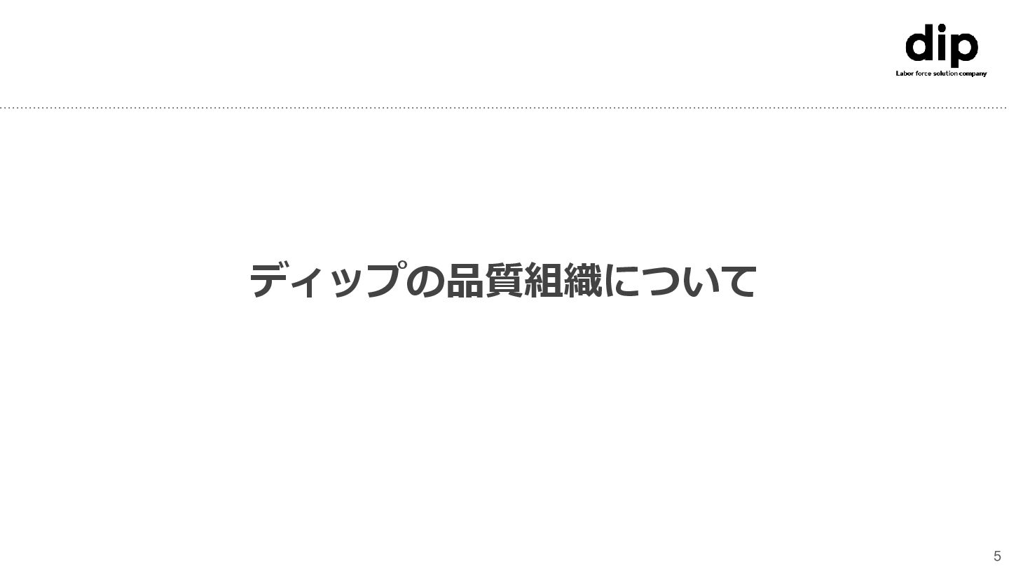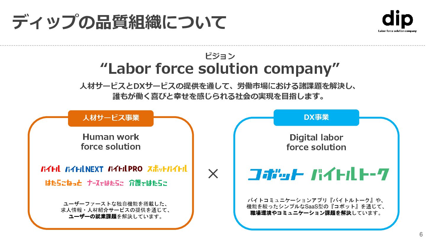 labor force solution バイトコミュニケーションアプリ『バイトルトーク』や、 機能を絞ったシンプルなSaaS型の『コボット』を通じて、 職場環境やコミュニケーション課題を解決しています。 人材サービス事業 Human work force solution ユーザーファーストな独自機能を搭載した、 求人情報・人材紹介サービスの提供を通じて、 ユーザーの就業課題を解決しています。 ディップの品質組織について 6