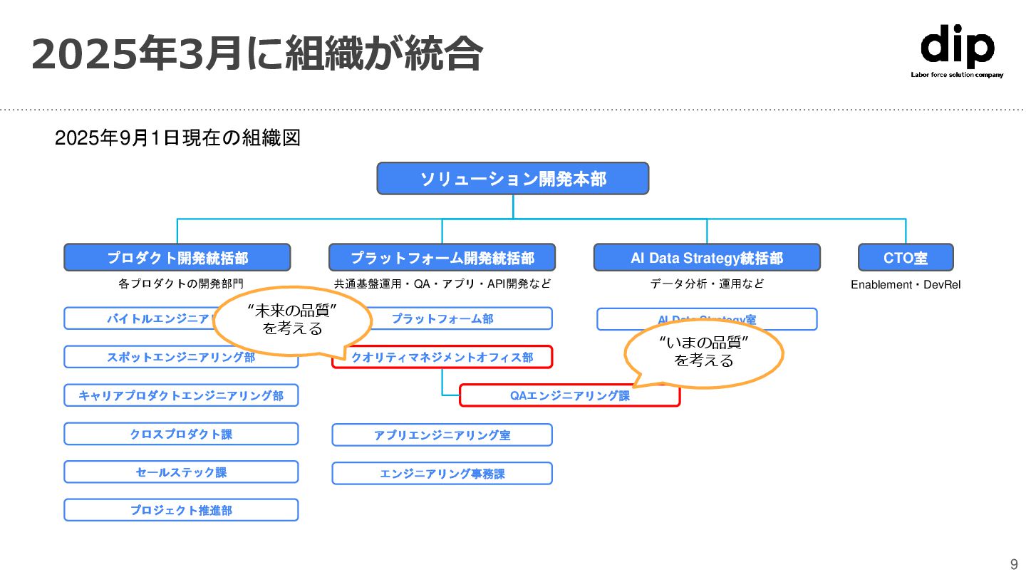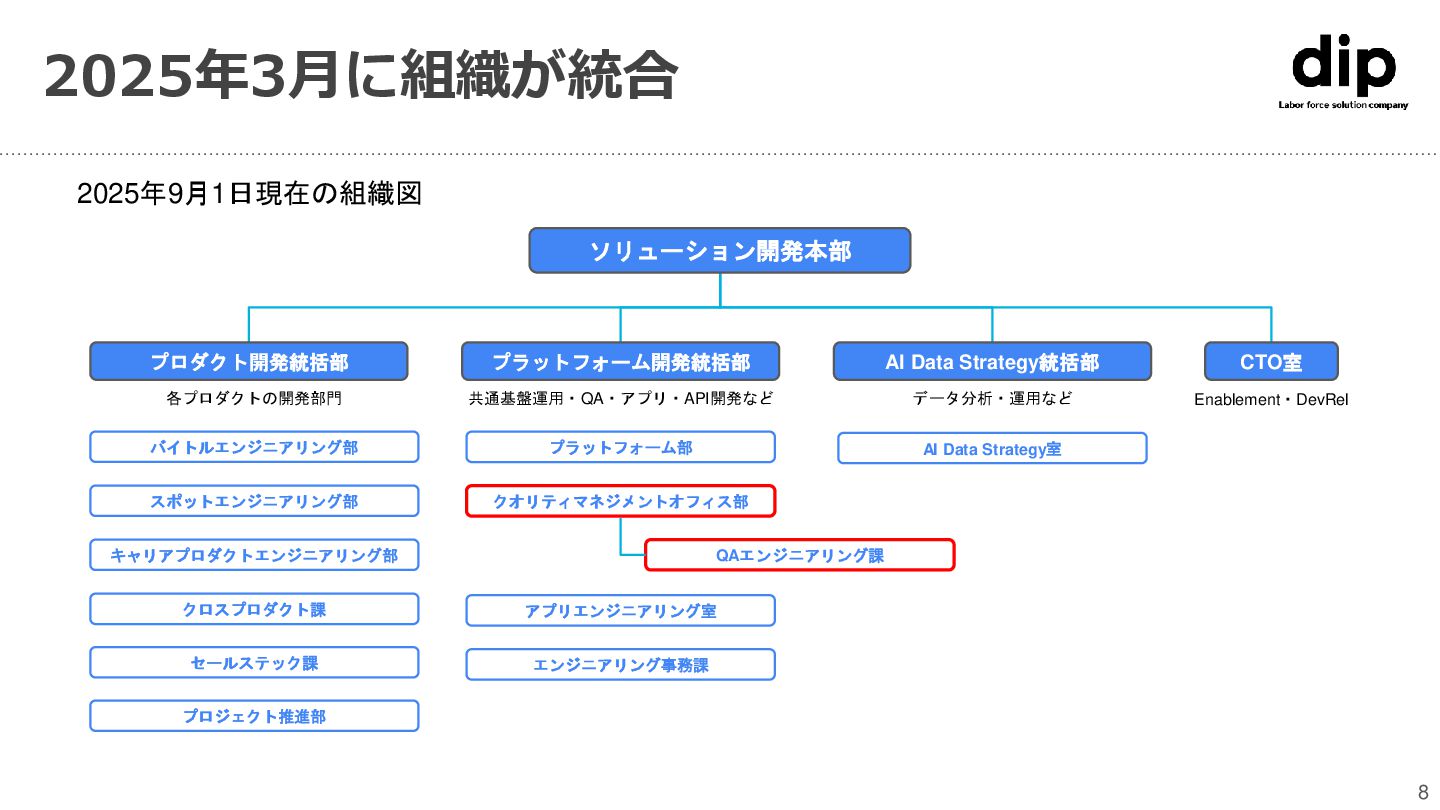 バイトルエンジニアリング部 スポットエンジニアリング部 キャリアプロダクトエンジニアリング部 クロスプロダクト課 セールステック課 AI Data Strategy室 ソリューション開発本部 プロダクト開発統括部 プラットフォーム開発統括部 AI Data Strategy統括部 CTO室 プロジェクト推進部 各プロダクトの開発部門 QAエンジニアリング課